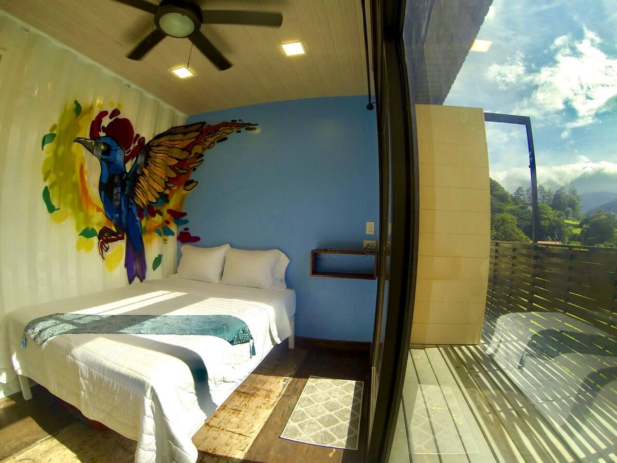 Welcome to Bajo Boquete's first eco friendly shipping container MICRO-UNIT with QUEEN bed! One of a kind graffiti art by Panamá's most sought-after street artist, INSANO. Large en-suite bathroom, private patio, large outdoor space for relaxing and games. We wanted to offer the budget minded adventurous traveler a way to stay downtown in Bajo Boquete with private amenities WITHOUT breaking the bank. If you believe in spending your vacation dollars out in nature, this is the place for you!