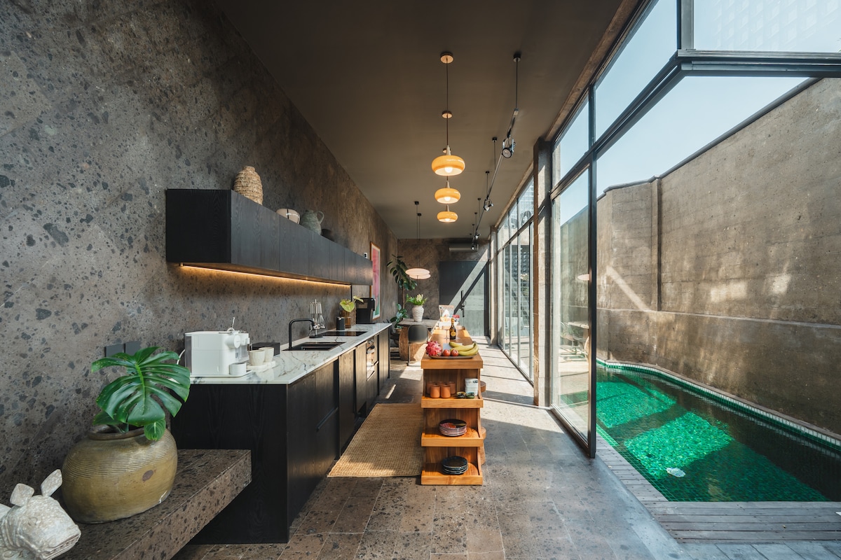 Indulge in our one-of-a-kind industrial 2BD villa, crafted with contemporary luxury, comfort, and convenience in mind. Every inch is designed to the highest standards, featuring top luxury brands throughout. Enjoy a personal sauna available from 8 am–5 pm and an in-bedroom jacuzzi to perfect your stay. Immerse yourself in the private pool, Smart TVs, a fully equipped kitchen & scenic lush greenery. Located in Seminyak's vibrant neighbourhood, perfect for unwinding & indulging in modern comforts!