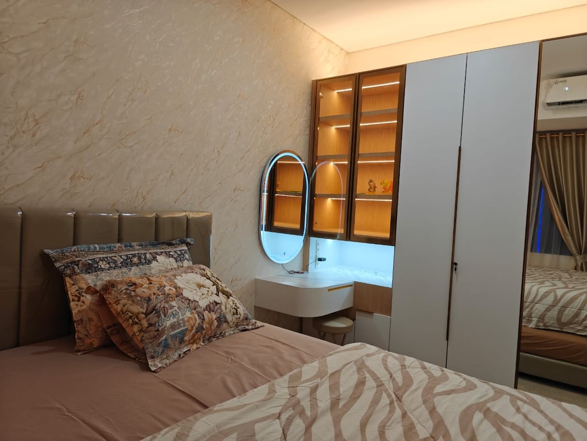 Novo prenovljeno stanovanje Podomoro City Deli Medan Ponuja razkošno bivanje z udobnim in domačim dizajnom. Iz udobja vašega okna in balkona boste našli očarljiv čudovit razgled na mesto. Nahaja se v središču mesta Medan. • Neposreden dostop do nakupovalnega središča Podomoro neposredno iz preddverja v stanovanju • Nasproti hotela JW Marriot • 8 minut sonca in CP • Zelo lep pogled na mesto • Full Furnish Lux • 2 enoti Big Smart TV (z Netflixom, YouTubeom itd.) • hitra povezava Wi-Fi • čistilec zraka