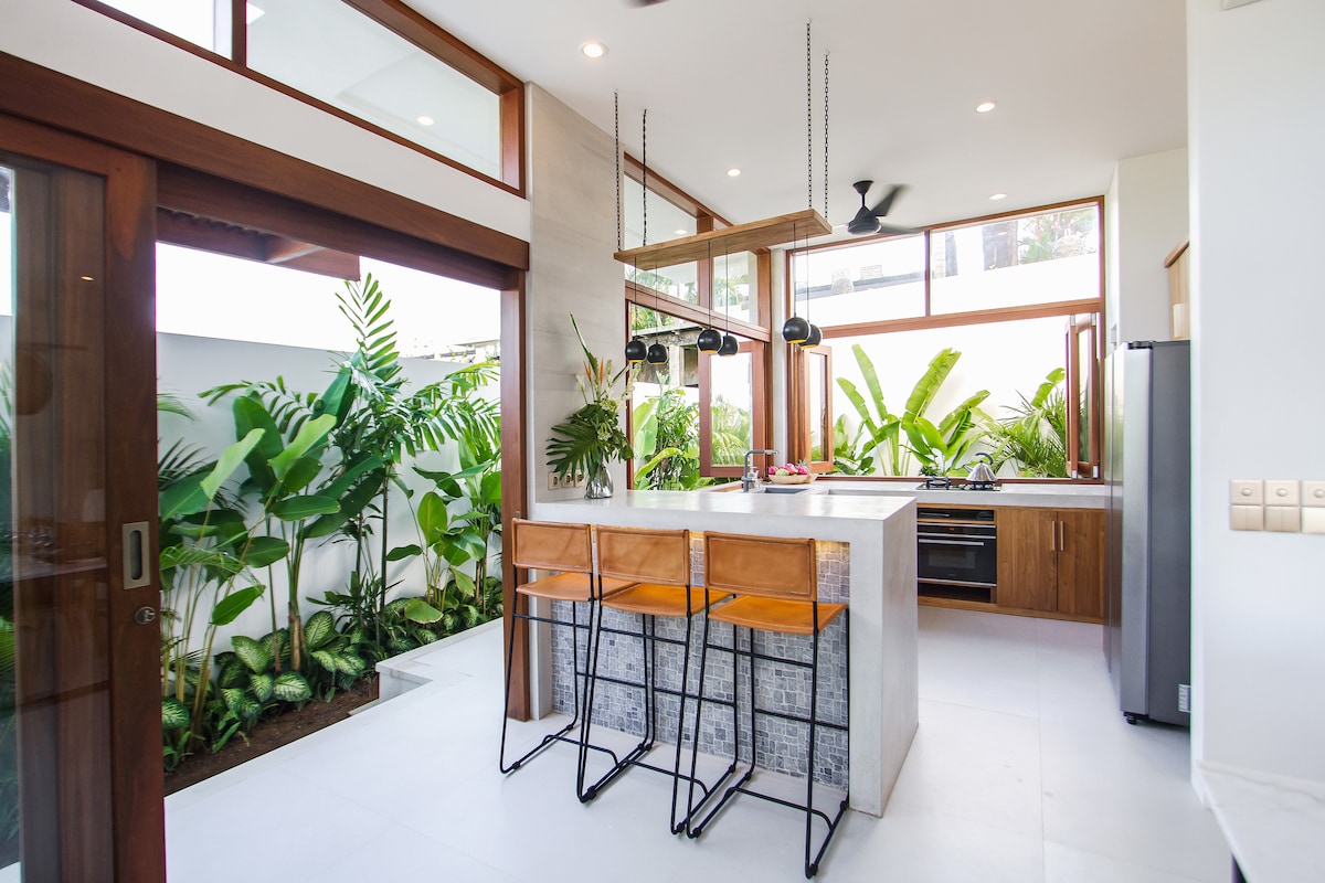 Uživajte v elegantnem doživetju v tem bivališču, ki se nahaja v središču mesta. *Sodobna popolnoma NOVA dvosobna vila z zasnovo predelanega stanovanja, zasebnim bazenom in prostorom za sprostitev *Srce Cangguja, 1,5km do PLAŽE ECHO (LA BRISA), 1,6 km do PLAŽE BATU BOLONG * Izjemno hiter Wi-Fi z optičnimi vlakni (150 Mb/s), kot nalašč za delo in pretočno predvajanje *SmartTV(Netflix,Youtube) *Velika dnevna soba in sodobna, popolnoma opremljena kuhinja z vsem, kar potrebujete *2 udobni spalnici s kopalnico in klimatsko napravo *Parkiranje *V bližini kavarne Crate in Københavna
