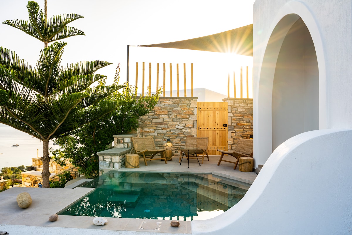 Fully equipped 40sqm self catering suites with use of the infinity pool, set in an intimate, rural complex with beautiful landscaped and maintained gardens. Luxury Italian furnishings, flat screen TV with Netflix, very fast Wi-Fi. Own terrace and deck with breathtaking 270 degree views over the Aegean sea, surrounding islands and sunset. Suited for couples and families looking for a quality, safe and peaceful environment yet very close to the main town of Chora. Not suited for party people!!