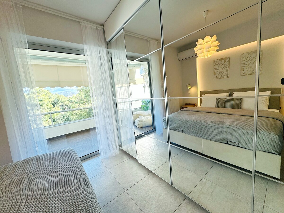 Naše na novo prenovljeno počitniško stanovanje s 45 m2 je elegantno, minimalno in hkrati udobno, da se boste počutili kot doma. Prenočišče bele in najbolj sive barve je podnevi polno naravne svetlobe. Naša zasebna terasa s 100 m2 vam bo nudila vso spokojnost in tišino, ki jo potrebujete med počitnicami, tako da boste uživali v osupljivem razgledu na zaliv Vouliagmeni. Blizu plaž, smučarske fakultete, teniškega igrišča, košarkarskega igrišča, hotelov, restavracij, gozdov, parkov, 30 minut od atenskega središča, 30 minut od atenskega letališča.