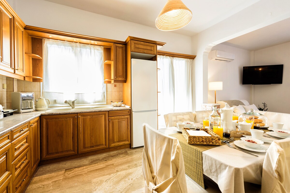 Pritličje stanovanje tradicionalnega cikladskega sloga, v osrčju naselja Parikia. Idealno se nahaja, ponuja mir in sprostitev ter priročno osrednjo lokacijo. Peš: vse zanimive znamenitosti (stara tržnica, frankovski grad), pekarna, trgovine. Morje je od hiše oddaljeno nekaj metrov, v 2 minutah pa lahko pridete do ulice ob morju, kjer lahko uživate v pogledu na sončni zahod. Pristanišče, avtobusna postaja in taksi postaja so oddaljeni 3 minute peš.