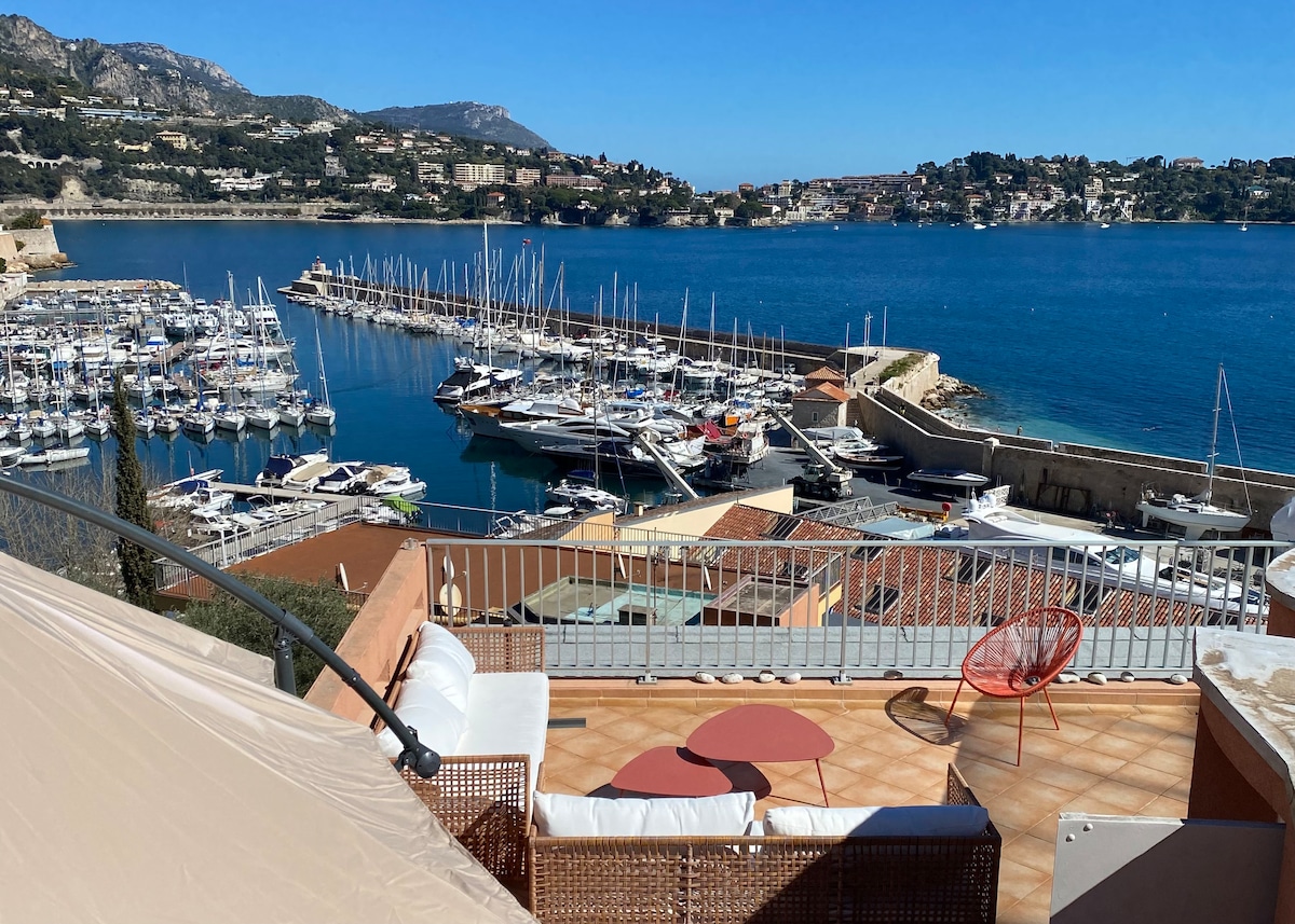 2 postelji/2 kopalnici NOVA prenova - nove naprave - 75 m2! Nadstandardna mirna ulica vil tik nad starim mestnim jedrom Villefrancheja, plažami in restavracijami. 4 minute hoje (stopnice) ali 1 minuto vožnje do starega mestnega jedra. Enostavno parkiranje na ulici. Kratek sprehod do vlaka ali avtobusa. Zasebni vhod z ulice. Velika sončna dnevna soba in jedilnica z dvojnimi francoskimi vrati s pogledom na vrt spodaj. Delni pogled na morje. Fiber Wi-Fi 300 Mbps. Centralna klimatska naprava in ogrevanje. Nespresso aparat in stroki. Udobne postelje in fina posteljnina. Pametna televizija.