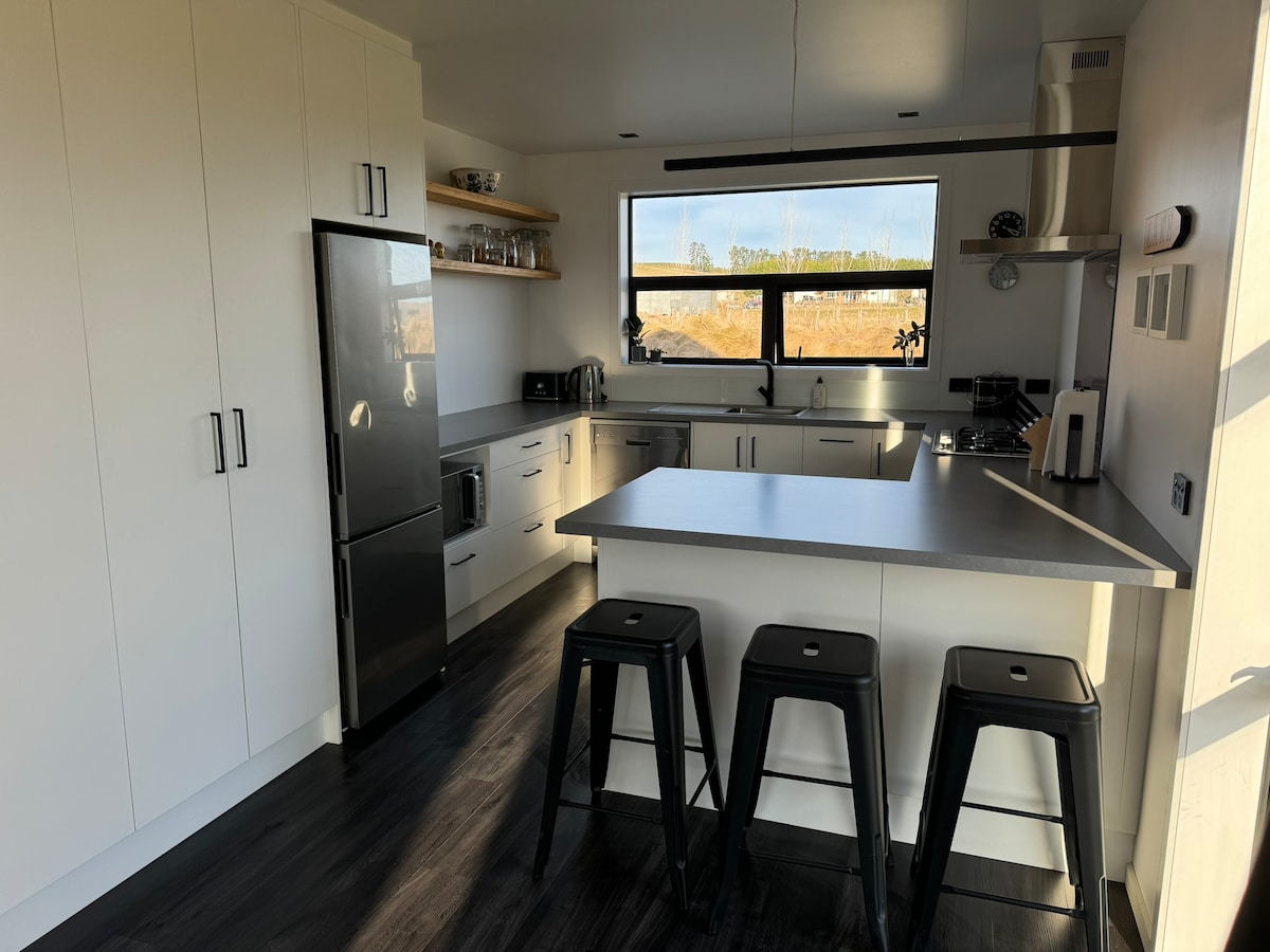 Relax at The Black House, a warm, sunny eco-friendly retreat set amongst rolling countryside. This stylish three-bedroom modern home offers comfort, full amenities, and stunning Mt Dobson and alpine views. Walk to Lake Opuha or explore nearby Fairlie township and Lake Tekapo. Soak in the outdoor bath under world-renowned dark skies—perfect for unforgettable stargazing. Ideal for romantic, peaceful escapes or family adventures, with generous open grounds to unwind and reconnect.