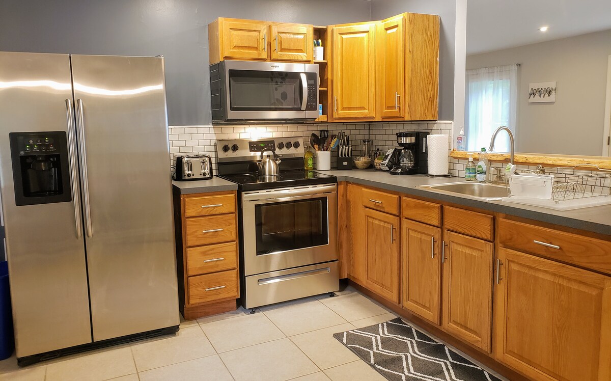 Popoln oddih za dan tekme, družinska srečanja ali miren oddih. To prenočišče ima štiri spalnice, polno kopalnico, polovično kopalnico in popolnoma opremljeno kuhinjo. Odmaknjeno dvorišče ponuja neposreden dostop do parka, pokrito teraso s sedeži za 8 oseb in 75-palčno televizijo Roku. V notranjosti je dnevna soba v glavnem nadstropju udobna za 8 oseb in vključuje še en 75-palčni Roku TV, ki je idealen za sprostitev. Na priročni lokaciji v bližini restavracij, trgovin in trgovin z živili, za namestitvijo pa so parkirne poti, primerne za pse.