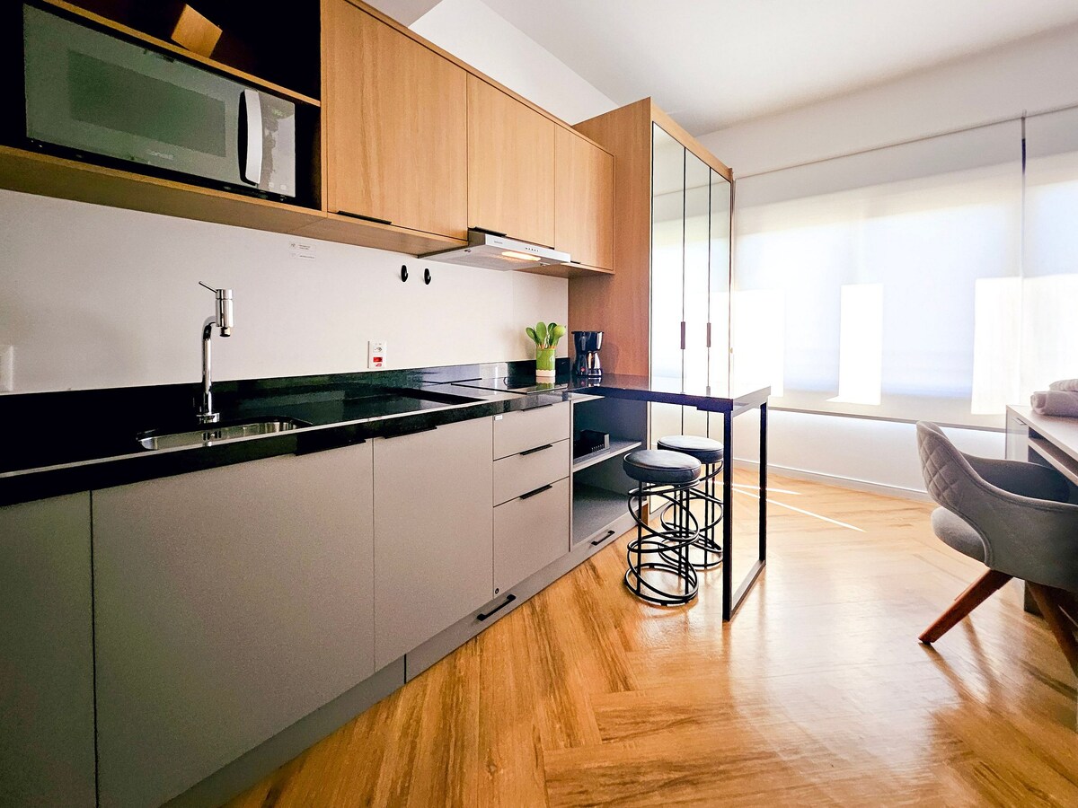 Viva uma experiência única neste estúdio acolhedor e elegante, projetado com atenção aos detalhes para oferecer conforto, funcionalidade e muito estilo. O ap azul planejado é um diferencial exclusivo, com iluminação suave e decoração pensada para relaxar, móvel inteligente e versátil que se transforma em mesa de jantar ou apoio para cozinhar — perfeito para quem valoriza funcionalidade. Piano digital disponível para relaxar, praticar ou se inspirar. Smart TV, Wi-Fi.