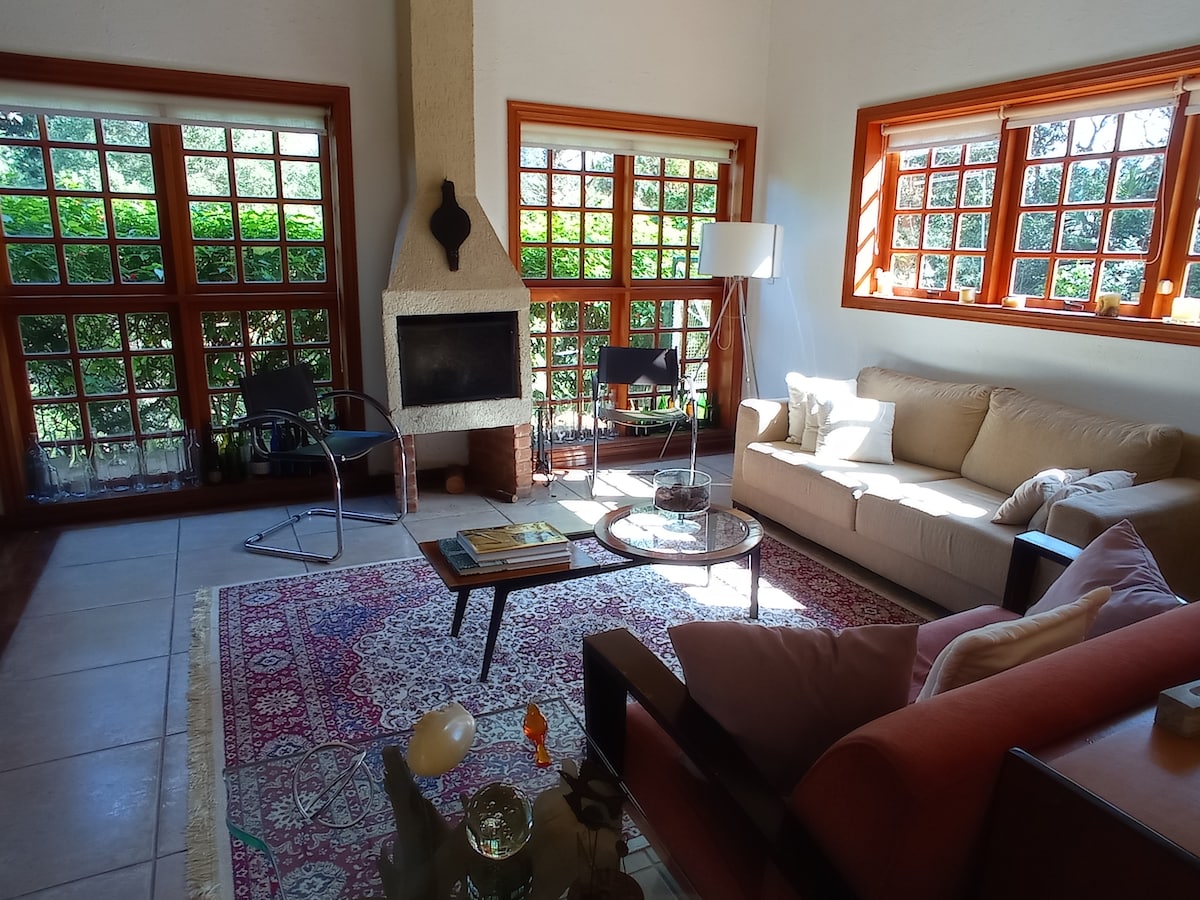 A casa é uma delícia! Ampla e acessível. Sala com lareira, cozinha e churrasqueira integradas a uma varanda enorme. A vista? Só se vê o verde... Tucanos e esquilos serão seus vizinhos. Segura e divertida para crianças de todas as idades e com piscina! Ideal para fim de semana/feriados, comemorações familiares, para trabalhar ou passar temporadas maiores, até mesmo para recuperar a saúde. Estamos dentro de um bolsão residencial calmo e, ao mesmo tempo, perto de restaurantes, shopping, mercados.