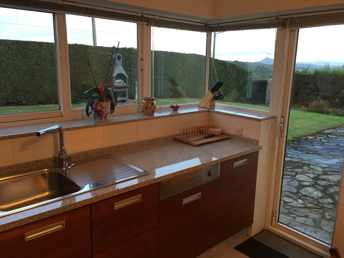 La acogedora casa tiene un concepto abierto con un espacio diáfano. Cuenta con un dormitorio con cama king-size, un sofá-cama, dos baños y una pequeña cocina. Dispone de Wi-Fi gratuito, calefacción, bañera de hidromasaje y TV de pantalla plana. La parcela tiene aparcamiento privado, terraza y jardín amplio. La Casa de la Pradera se sitúa en A Baña, A Coruña, Galicia. A 2 km de Negreira, pueblo que ofrece todos los servicios. A 16 km de Santiago de Compostela y 30 km de las playas.
