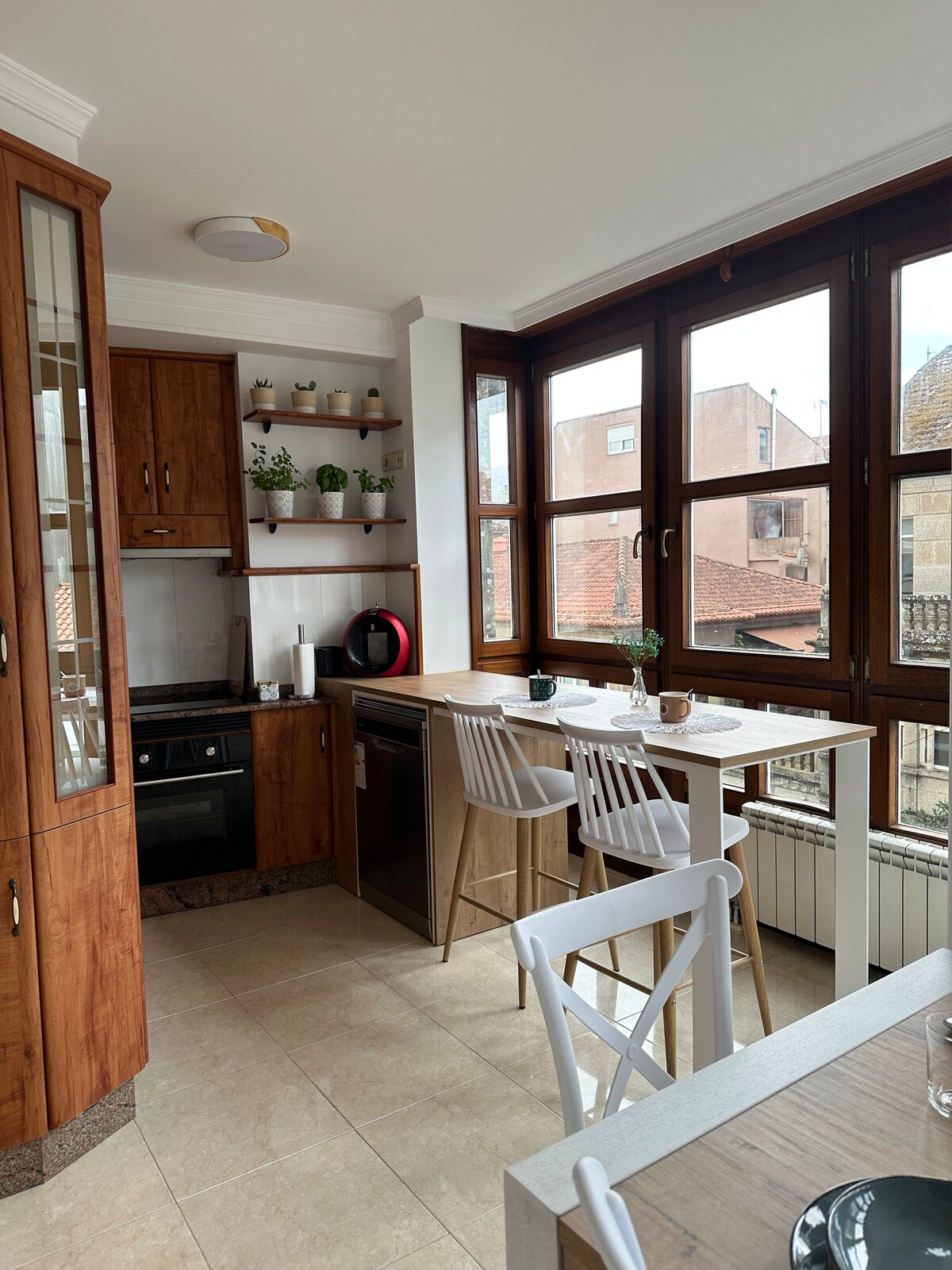 Excepcional apartamento de 52m2, con 1 cocina-sala con sofá cama de 1.35, 1 habitación con cama de 1.35 con,1 baño con plato de ducha y una galería muy luminosa,justo en la calle de entrada a los peregrinos a la ciudad.Una calle espectacular por su vida y alegría durante el día y la noche.Pero para descansar sin que nos moleste nada , el apartamento cuenta con una habitación en la parte trasera del edificio.Es un 3º por escalera