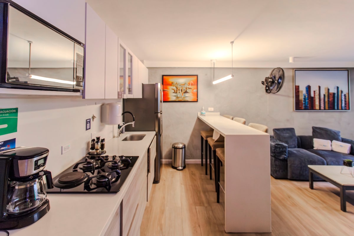 Celotno stanovanje. Uživajte v doživetju v hotelu 1Million Suites, ki se nahaja v najboljši soseski (Poblado) v mestu. Imamo bar. Le nekaj minut hoje od Provanse, enega najhitreje rastočih območij za hrano in prosti čas v mestu, v bližini parka Lleras z najboljšimi mesti v Medellinu, bari, banke, bankomati, nakupovalna središča, menjalnica itd. Vse aplikacije za dostavo delujejo v namestitvi.