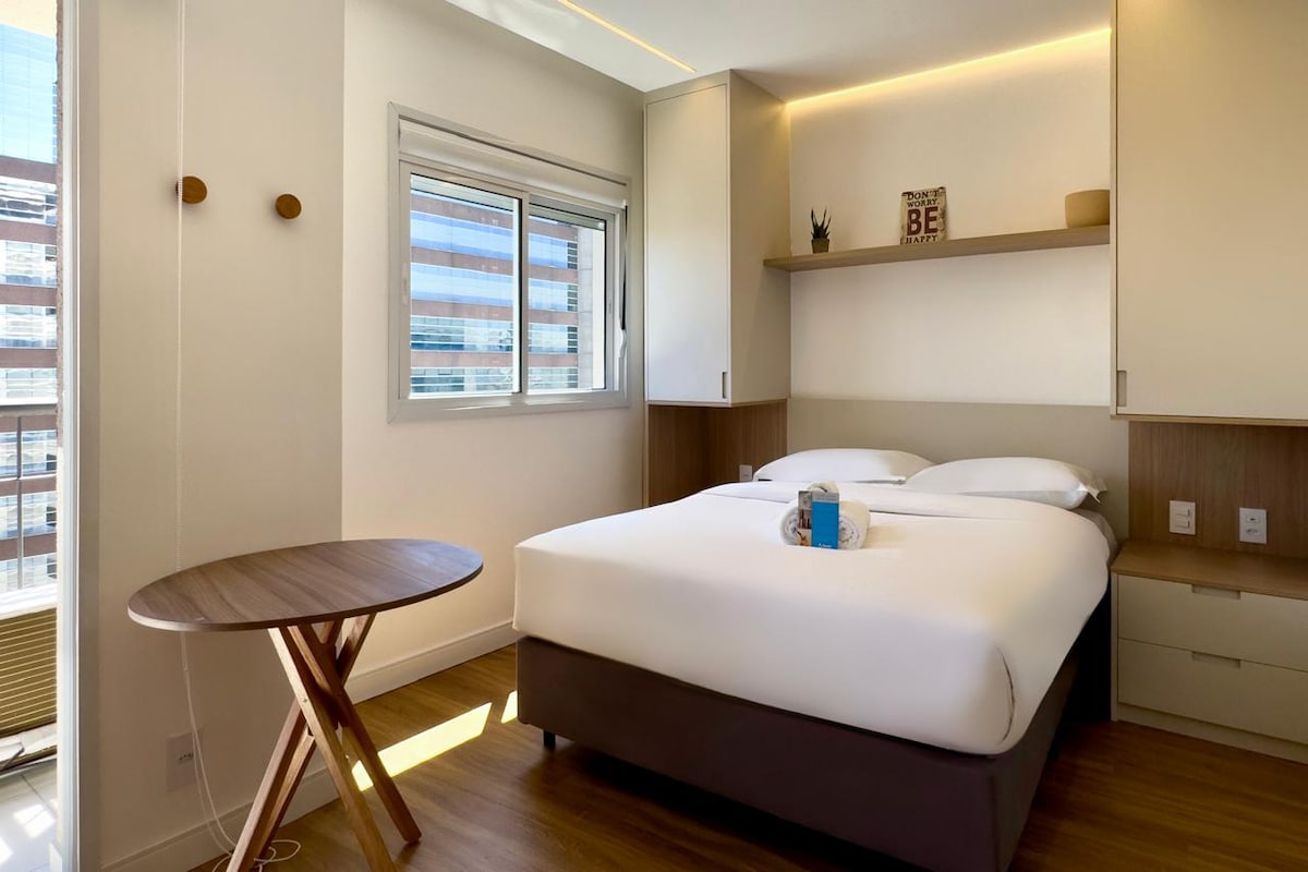 Stanovanje s klimatsko napravo, zasebno kopalnico, televizijo z ravnim zaslonom, ki se lahko uporablja za spalnico ali dnevno sobo, brezplačen brezžični internet, pisalna miza, dnevna soba in kuhinjska niša ter parkirno mesto. Stavba ima tudi restavracijo v pritličju, dobro opremljeno telovadnico in bazen. Nakupovanje JK Iguatemi to 100m in Parque do Povo Bližje letališče je letališče Congonhas približno 6 km. Javni prevoz, kot so avtobusi in vlaki, ki se povezujejo s podzemno železnico, so v bližini.