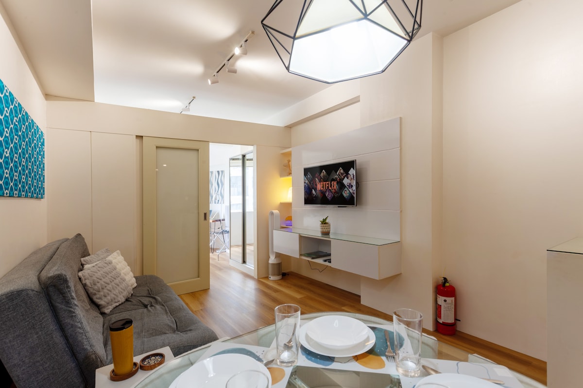 Dobrodošli v našem zračnem sodobnem in sredozemskem slogu Tahanan, 25 m2 velikem studiu v Mandaluyongu, le kratek sprehod od Rockwella in nakupovalnega središča Powerplant Mall! Naš prostor smo zasnovali tako, da zagotavlja udobno bivanje, hkrati pa zajamemo osupljiv razgled na sončni zahod ter pogled na Mandaluyong in Makati z našega balkona. Ne glede na to, ali ste na obisku zaradi dela, prostega časa ali kombinacije obojega, je naš dobro opremljen Airbnb odlično izhodišče za raziskovanje živahnih mest Mandaluyong in Makati.