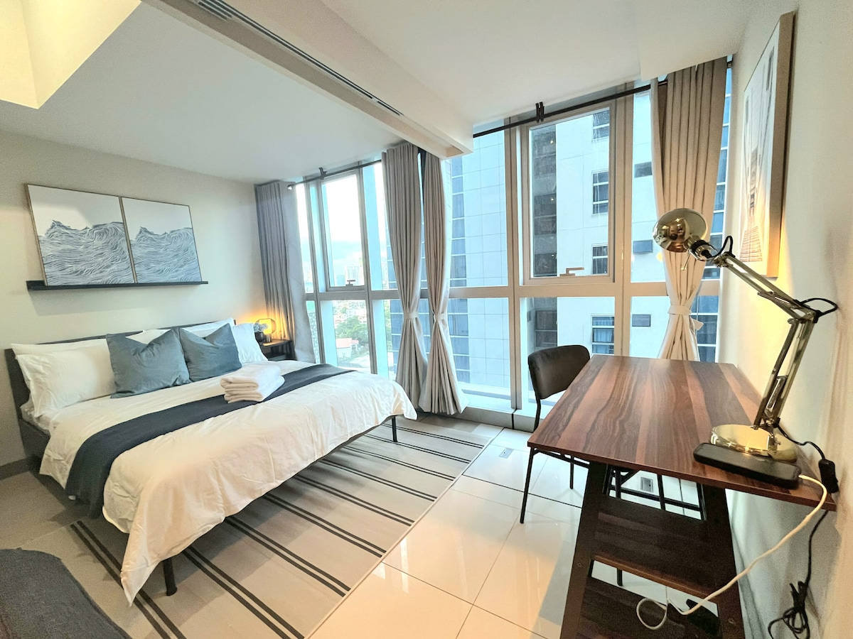 Rezervirajte to razkošno prenočišče v središču BGC. Vse je oddaljeno le nekaj korakov. Najboljše pisarne in vrhunska nakupovalna središča obdajajo Uptown Parksuites. Doživite kozmopolitski oddih v nakupovalnem središču Uptown Mall. Raziščite edinstvene koncepte hrane in nakupovanja. Zabavajte se v vrhunskih barih tik pred vašimi vrati. Sprostite se v naši sodobni spalnici iz sredine stoletja. Udobje vključuje 55-palčni PAMETNI televizor, internet S HITROSTJO 400 MB/S in študijsko območje. Uživajte v udobnem in elegantnem doživetju v tem bivališču, ki se nahaja v središču mesta.