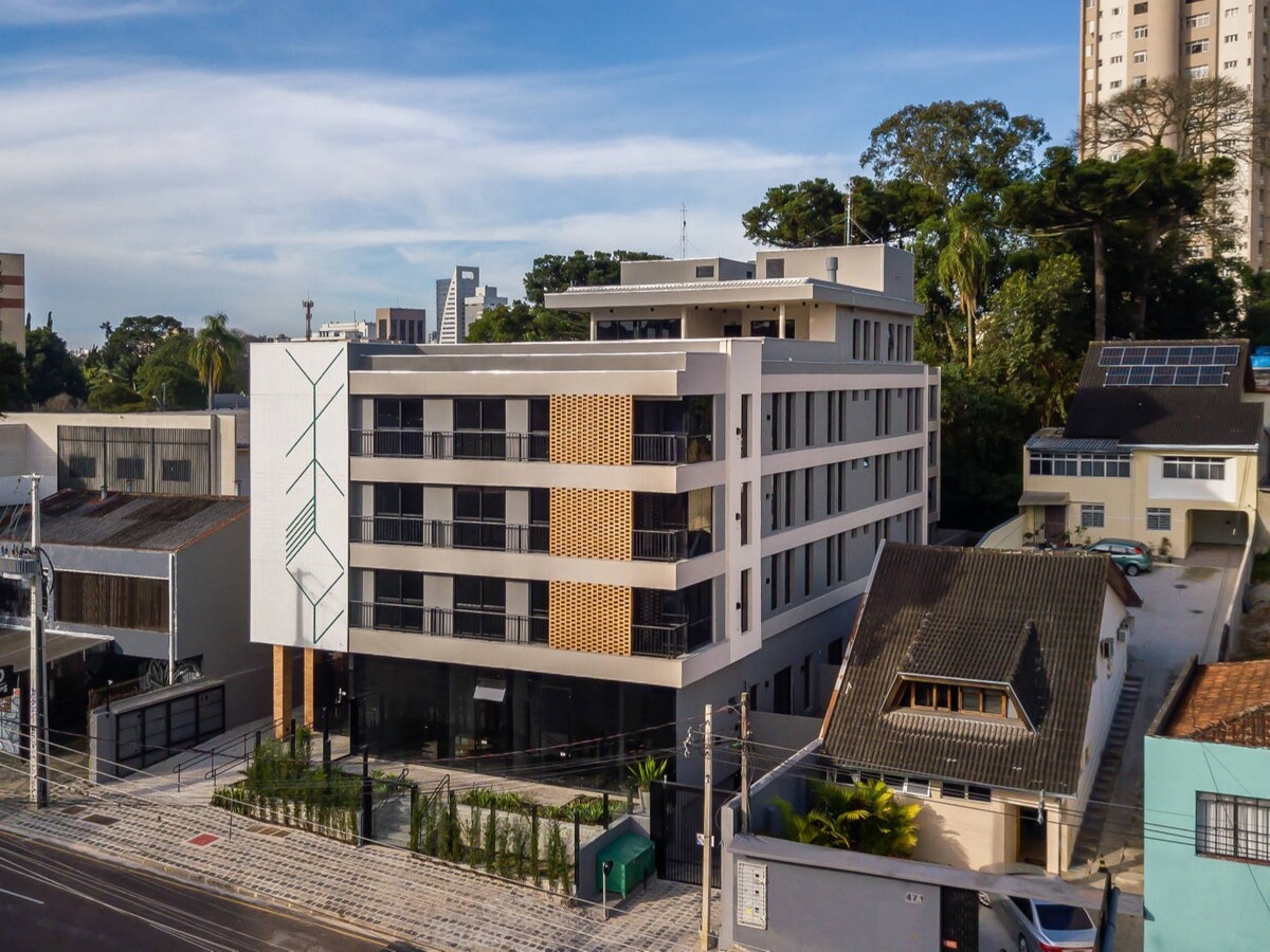 Studio amplo, funcional e silencioso em localização privilegiada. Cama king-size, sofá-cama com colchão de verdade, TV com Chromecast, internet rápida e espaço dedicado para trabalho, varanda com cadeiras confortáveis e vista para o Bosque do Papa, cozinha funcional com cooktop, microondas, frigobar e o essencial para fazer café e preparar refeições simples. Em poucas quadras você encontra MON (Museu do Olho),, Bosque do Papa, Supermercado, Farmácia, Conveniência 24h e ponto do Ônibus Turistico