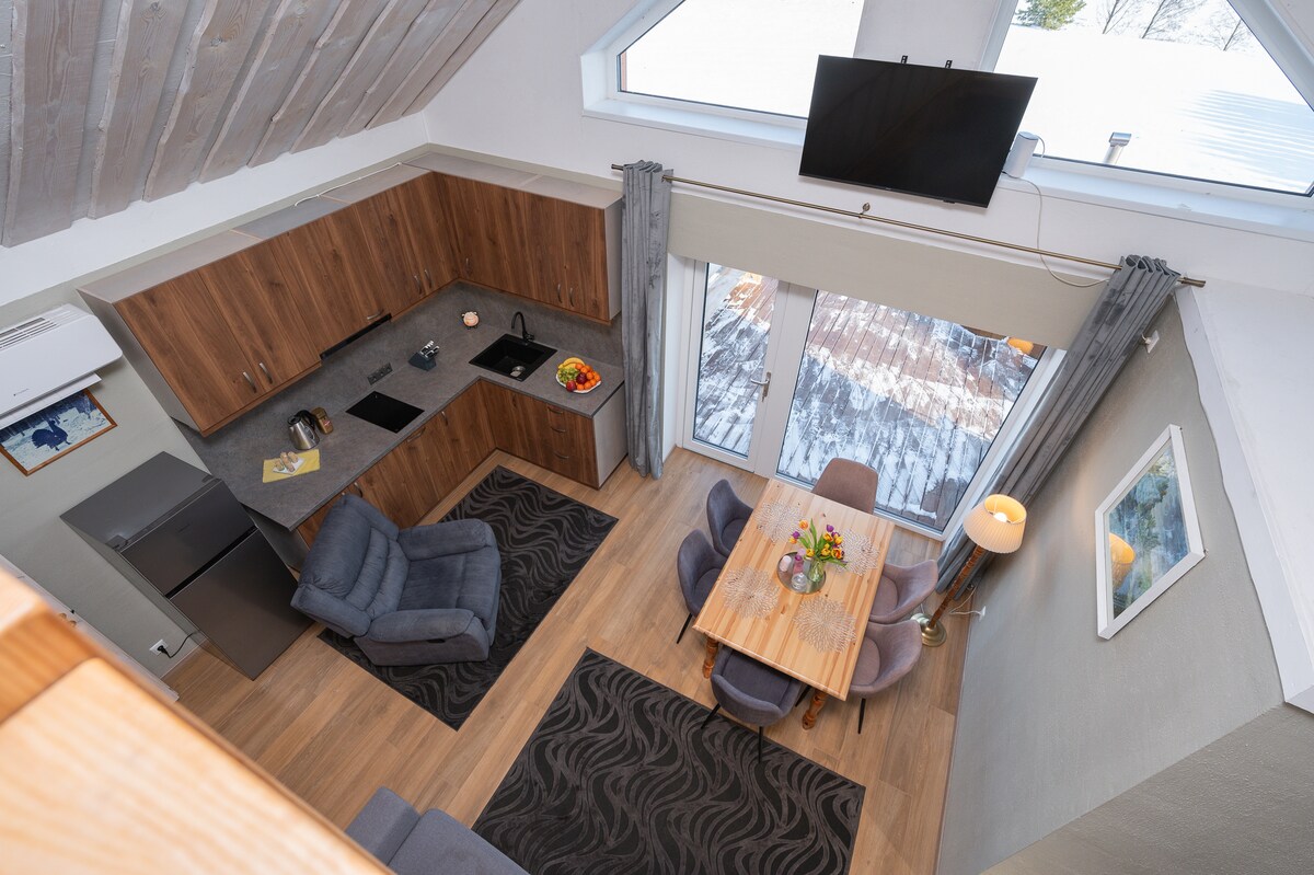 Historical house has been recently renovated. The first floor has a living room-kitchen, a bathroom and a hallway. On the second floor there is a bedroom with eight beds, including one double bed. The kitchen has everything you need for cooking, including a stove and a fridge. Next to the house is a spacious roofed terrace, where it is nice to sit and enjoy the birdsong, play table tennis or grill. It is also possible to offer an hot tube for a special fee