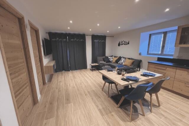 Garsonjera je prenovljena v velikosti 17 m2, idealna za 2 osebi, vendar lahko sprejme 4 osebe Ima 4 postelje, raztegljiv kavč v dnevni sobi in 2 postelji na vhodu 2 min hoje od žičnic(150 m) in v bližini vseh trgovin, brezplačna postaja za prevoz je tik pod bivališčem Stanovanje ima pomivalni stroj, aparat za kavo, opekač kruha in grelnik vode ter omarico za smuči Rjuhe, brisače in čiščenje so vključeni v brezplačen Wi-Fi