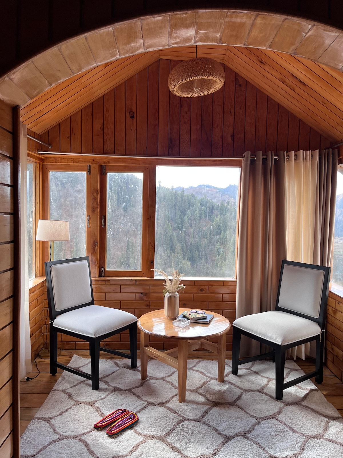 A serene glass house with a private jacuzzi, located within the peaceful grounds of Tirthan Chalet. Surrounded by a persimmon orchard and mountain views, this stay is perfect for couples seeking privacy, nature, and slow living in Tirthan Valley.