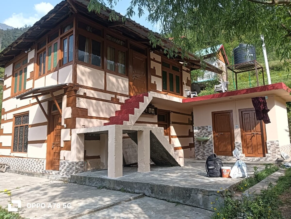 Exclusive Full-Property Buyout: Book 3 Ensuite Rooms (upper floor) with the Cozy Scent of Devdar Wood, Private Lobby & Orchard with 180° river views + Caretaker Service Exclusively for your group. Road-head access with free parking. Features: High-speed WiFi, pet-friendly orchard, bonfires & driver’s room. Explore: 📍2km: GHNP Gate (UNESCO) 📍2.3km: Choie Waterfall hike 📍11km: Bathad Waterfall 📍12km: Sarchi Meadows 📍2-min walk: Tirthan River Experience authentic Himachali warmth.