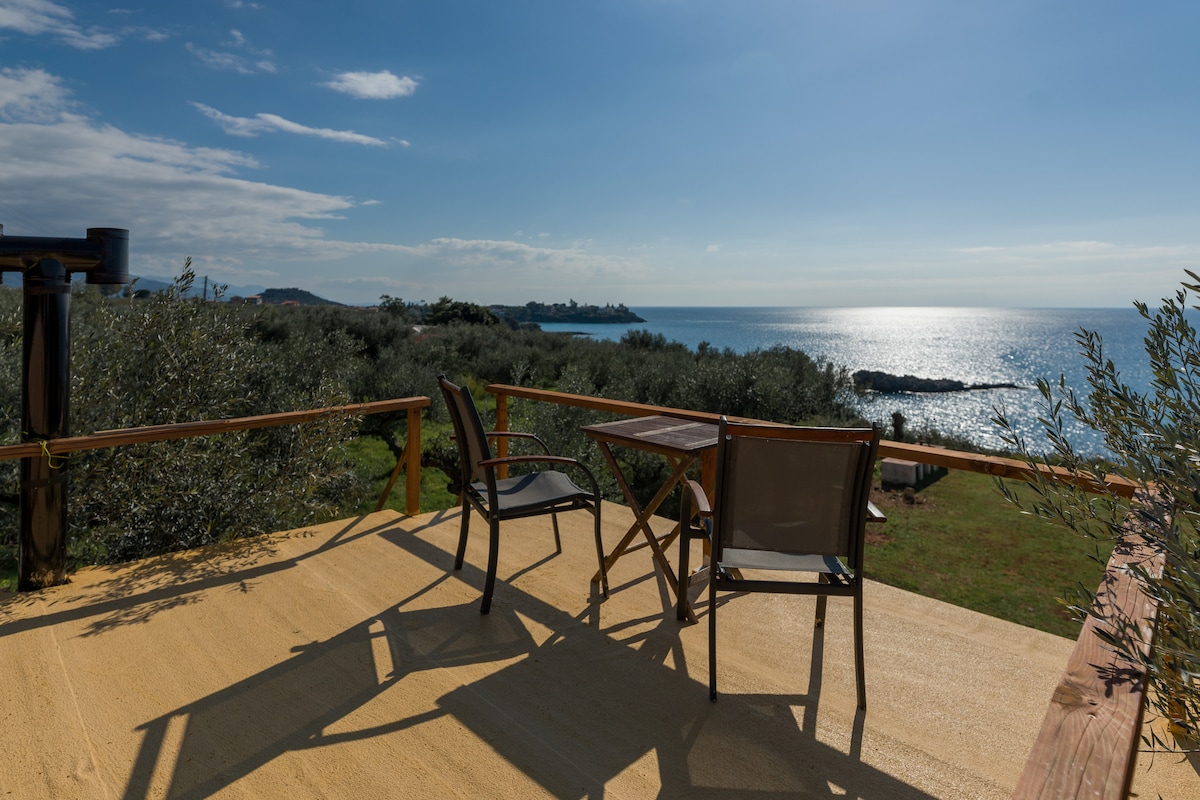 We are pleased to introduce you to our Tsikolina Bungalow. We offer a detached bungalow with private space and a breathtaking view. The location is ideal, right on the coast, close to Stoupa and in the middle of nature. The spacious terrace, with chairs, table and sun loungers, offers a magnificent view of the Gulf of Messinia. You can also enjoy this view from the outdoor shower belonging to the bungalow or the barbecue station.