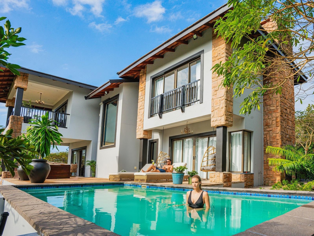 Welcome to the Splash Rock Villa The beautiful Splash Rock beachfront villa. The living areas open to a rim flow pool, Jacuzzi and wooden deck with a fire pit. The open plan; beautifully designed kitchen has substantial equipment for the lovely chef to cater for each and every one of our guests. This magnificent beach house is completely surrounded by forest with boasting ocean views, situated in the sunny coastal town of Port Shepstone, KZN. Sleeps 16 guests in total.
