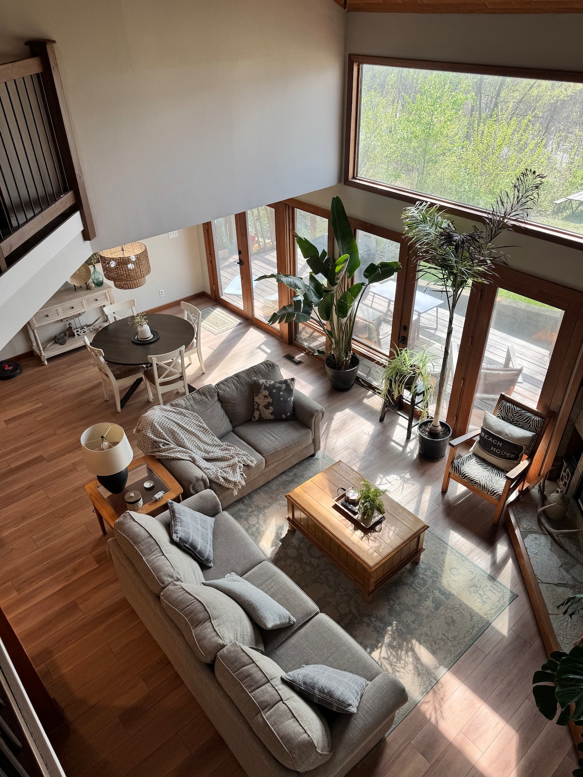 Relax at this cozy Cabin located across from the River Trail and right off I-74. Enjoy the wrap-around balcony, the privacy and tranquility of this beautiful place. Kids can stay in the loft w/ a reading nook and smart TV. Private master bedroom w/ touch lamps. Great location, close to everything. Large side lot with plenty of room for outdoor activities, including a fire pit. In-law quarters on the lower level w/ kitchenette, bathroom and queen bed upon request.