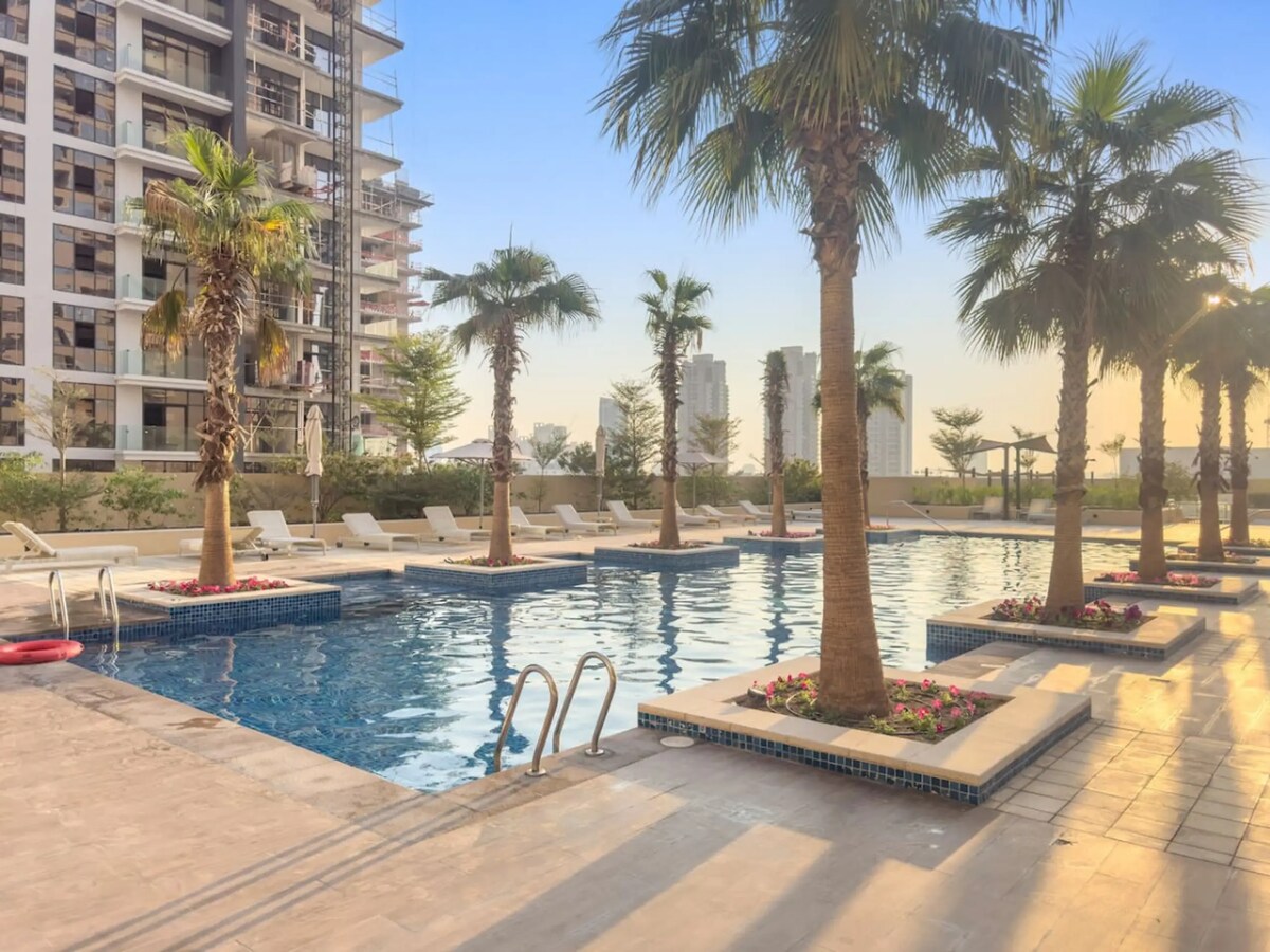 Sodoben 1BR Retreat v JVC z bazenom in razgledom na mesto