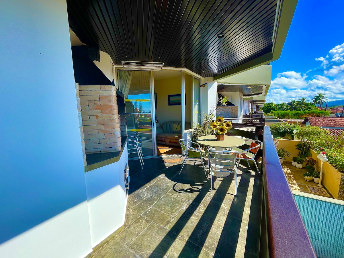 Área espaçosa com linda vista para o mar, a 100 m da praia. Apt duplex com piscina e churrasqueira privativas. Possui microondas, geladeira, fogão, lava roupas, 02 TV (cabo) e wi-fi. Aceita pets. Condomínio tem salão de jogos, sala de ginástica. 02 vagas de garagem cobertas e demarcadas. Tela na varanda. Acomoda até 08 pessoas. Excelente localização, perto de restaurantes, supermercados, farmácias, etc. ATENÇÃO: "A CONVENÇÃO DO CONDOMÍNIO NÃO PERMITE MAIS DE 08 PESSOAS, EM NENHUMA HIPÓTESE".