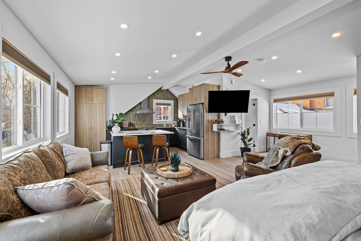 Prijetno zasebno stanovanje. Samopostrežni vhod v stanovanje brez ključa se nahaja po prvotnem stopnišču prenočišča od vhodnih vrat. Ena spalnica ima zakonsko posteljo in eno otroško posteljico. Kopalnica je opremljena z veliko kadjo in prho. Kuhinja ima naprave iz nerjavnega jekla in je v celoti opremljena z aparatom za kavo Keurig, grelnikom vode, lonci in ponvami. Pametni televizor vsebuje Netflix , Crave, da se lahko prijavite v spalnico, televizor v dnevni sobi pa ima Shaw Direct in Apple TV .