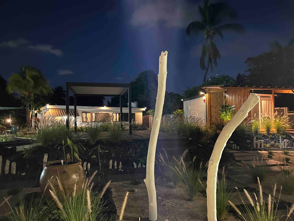 Enjoy a memorable stay in this unique and peaceful retreat.The hut is set within a secure and elevated residential property in Les Salines, just a short distance from the sea and surrounded by lush nature. It features a truly unique outdoor bathroom, nestled in a tropical garden and facing the beach offering a one-of-a-kind island experience. No houses directly in front, and plenty of space between neighboring properties, ensuring exceptional privacy. ✨ Boho deco .
