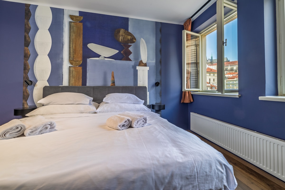 Our newly refurbished & beautifully decorated rooftop apartment is located in the centre of Prague and just 5 minutes walk to the Charles Bridge , 7 mins to Prague Castle and surrounded by beautiful parks at Petřín Hill or Kampa island. The apartment offers: air-condition, fully equipped kitchen, sound-proof windows, high quality mattresses for a comfortable sleep. Sleeps comfortably 2 people and a child. We can provide baby cot if you wish.