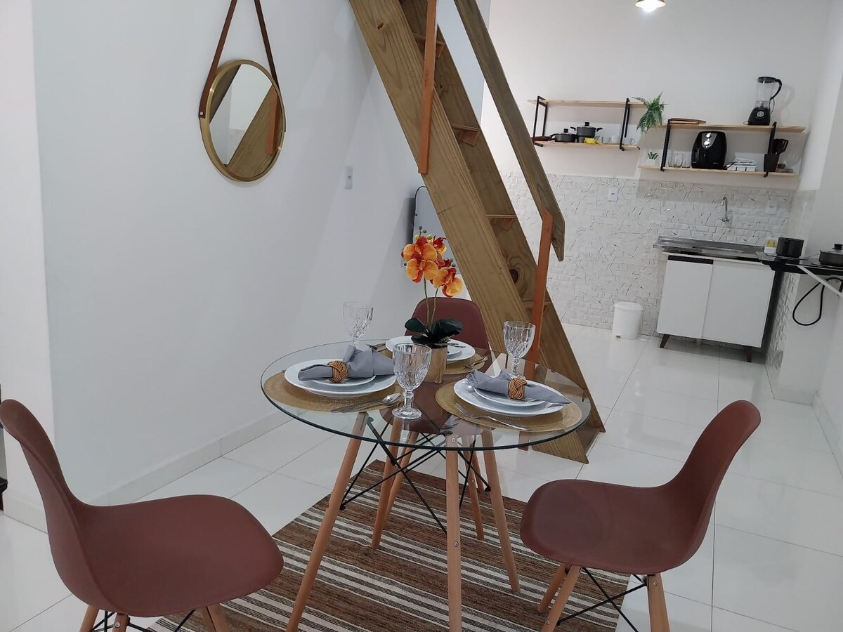 Welcome to your modern studio in the heart of Petrolina — a cozy space that combines comfort and practicality. Ideal for up to two guests, it features a queen-size bed, air conditioning, TV, fast Wi-Fi, and a workspace. The kitchen is fully equipped with an electric stove, refrigerator, microwave, air fryer, and coffee maker. We accept pets and offer a safe, functional, and very well-located stay.