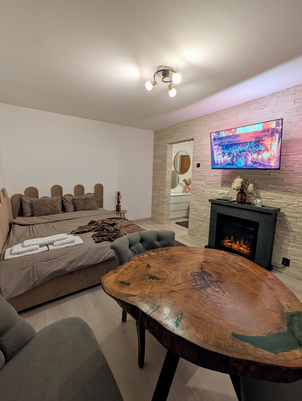 Cozy apartment located in the heart of Petrosani! Providing easy access to the train station, bus station, and taxi stand. This delightful apartment provides you with all the amenities you need for a truly relaxing stay. Stay connected with complimentary Wi-Fi and enjoy your favorite shows on the smart TVs provided. Unwind in the cozy king-size bed or make use of the comfortable sofa bed for extra guests. The generous shower area ensures a refreshing experience after a day of exploring.