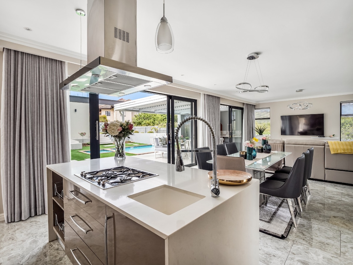 A stylish, newly decorated, ultra modern, convenient and comfortable house on highly sought after Pezula Golf Estate in Knysna. Walk to the private beach or just hang out at the pool, make a fire, braai and watch movies (all at the same time!). This house is fantastically oriented around the living areas which have everything you need for a break with the whole family. And when you need a break from the family; the bedrooms are spacious and super comfortable, and all have their own smart TV.
