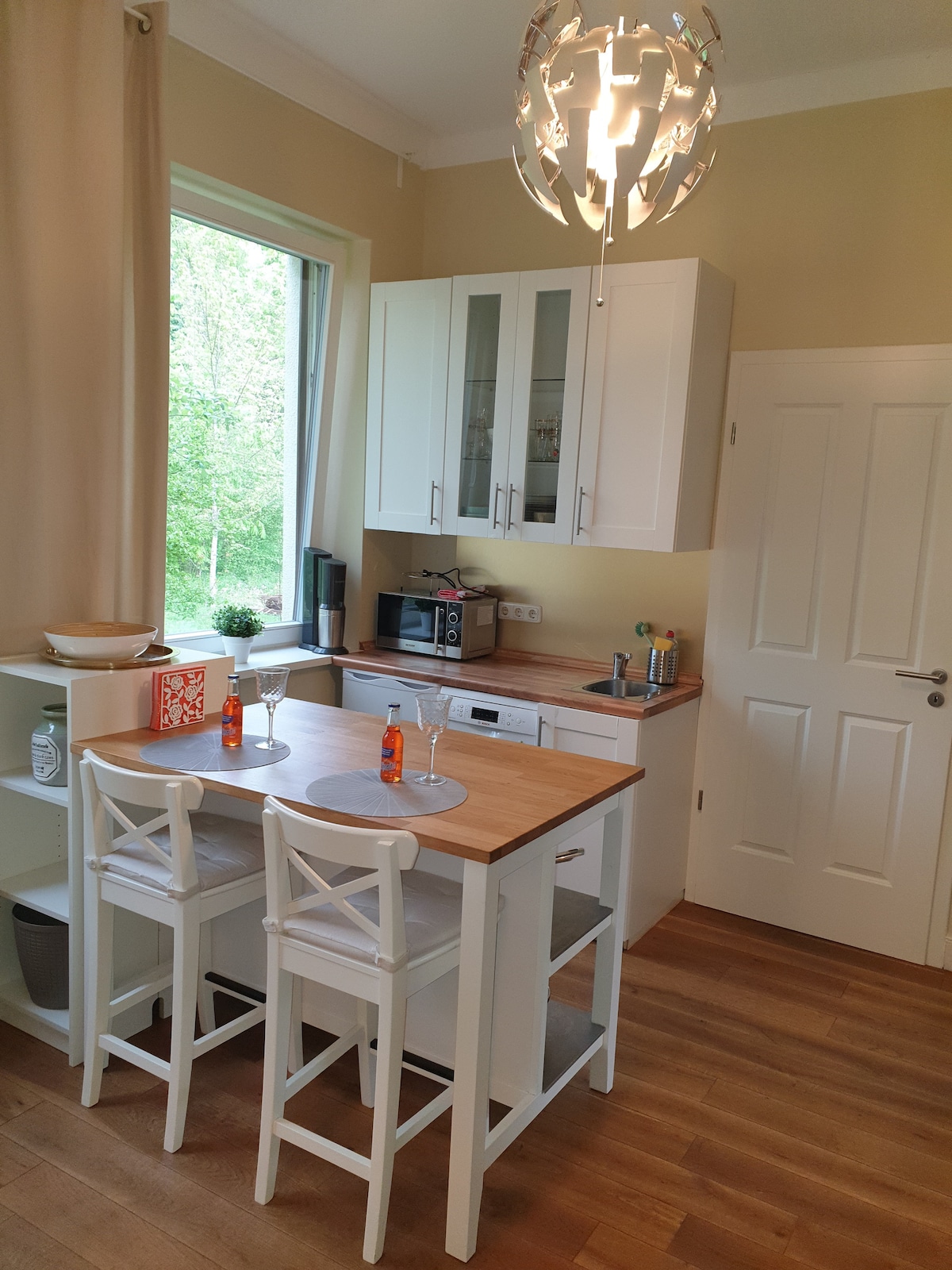 2 Zimmer Beletage West / Albert Einstein To stanovanje je sestavljeno iz 2 sob. Ima prho in ločeno stranišče na lastnem hodniku, ki ločuje to majhno stanovanjsko enoto od velike kuhinje-dnevne sobe. • Umivalnik v sobi / prhi in stranišče na lastnem hodniku • pritličje (6 stopnic) • Največ 7 oseb • Zakonska postelja 155 x 200 cm / 2 raztegljivi zakonski postelji 160 x 200 cm / raztegljiv kavč 90 x 200 cm • 44 m2 / 3,30 m višine sobe/ parket • Skupna kuhinja lahko sprejme do 14 oseb