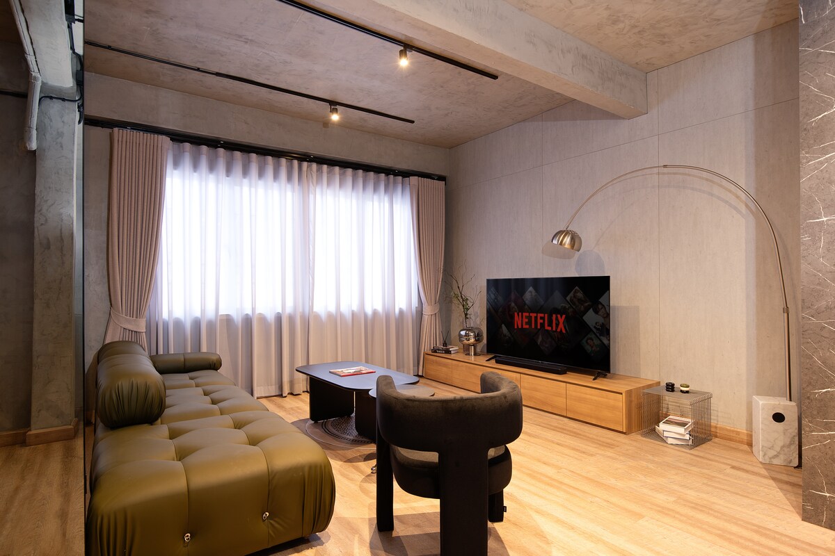 To ni samo prostor za spanje – to je prostor, ki dvigne vaše celotno potovanje. V mirni lokalni soseski lahko uživate izključno v naši trinadstropni oblikovalski hiši. V notranjosti drzni rdeči poudarki ustvarjajo vzdušje – retro, vendar futuristično, živahno, vendar sproščujoče. Z dvema zakonskima posteljama, eno enojno posteljo in dvema kopalnicama je kot nalašč za družine ali skupine prijateljev, ki potujejo skupaj. Kompaktna kuhinja vam olajša pripravo obroka, zajtrk ali daljše bivanje.