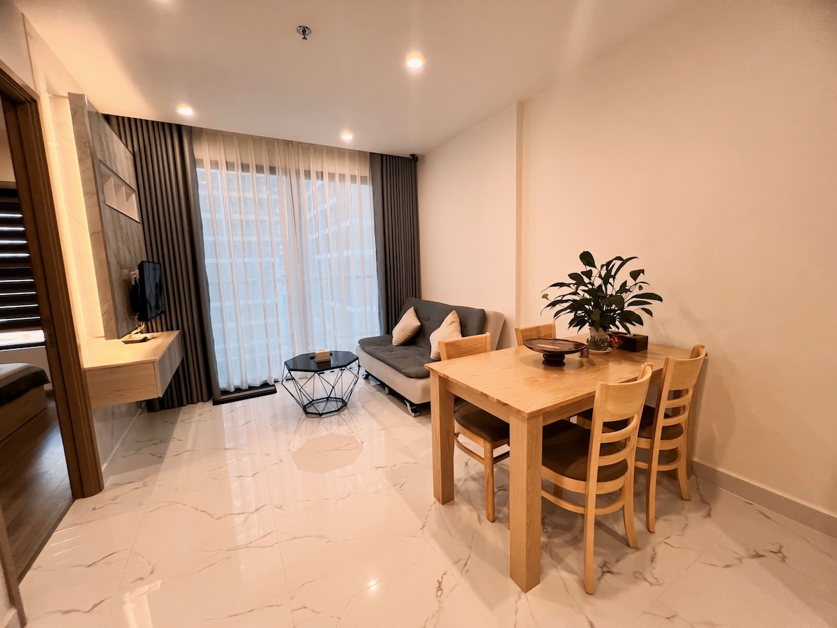 Dobrodošli v sodobnem in razkošnem stanovanju Stanovanje ima 2 spalnici, popolnoma opremljeno: dvoslojni hladilnik, električni štedilnik, pečico, mikrovalovno pečico, pralni stroj... Prostor je čist in urejen, kar zagotavlja, da se boste počutili udobno takoj, ko vstopite. Zunaj boste uživali v objektih: bazen s slano vodo, masažna kad, otroško igrišče in brezplačna telovadnica. Vedno si prizadevam, da bi vam zagotovil najbolj udoben, varen in udoben bivalni prostor ter vam bil na voljo med bivanjem.