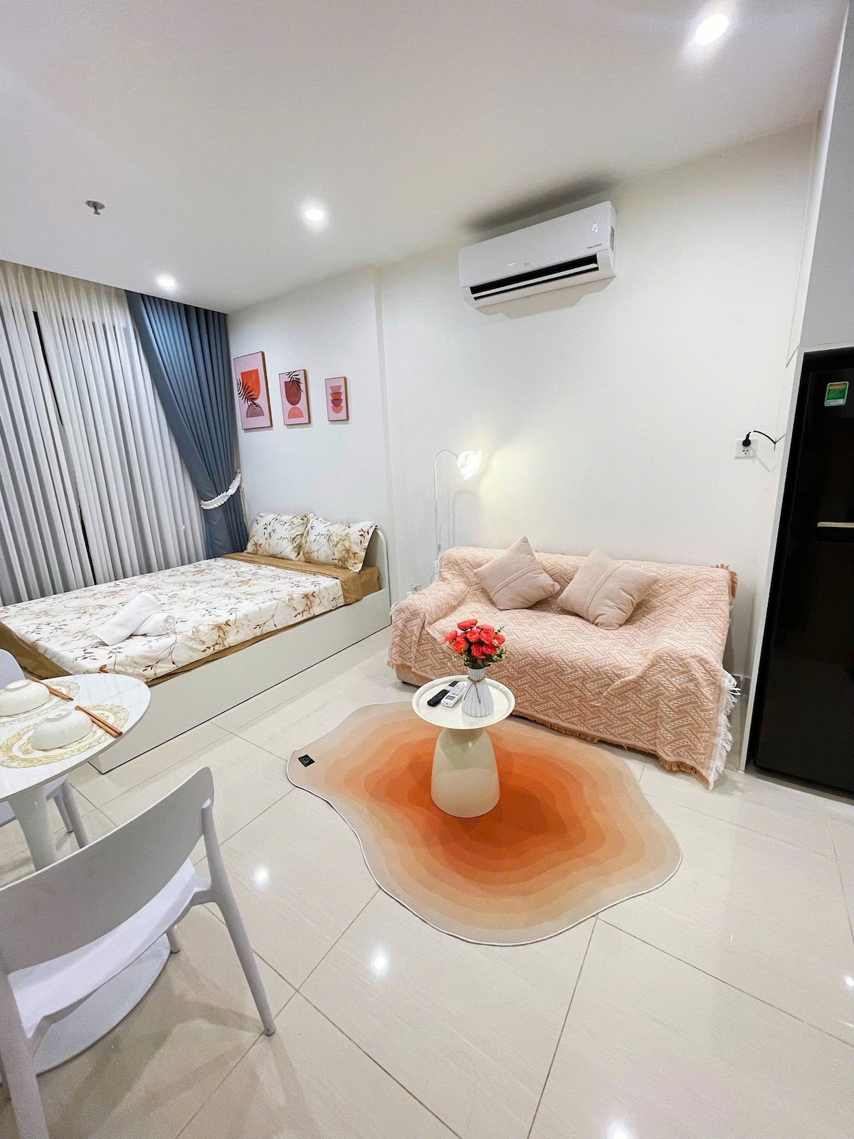 Studio – Vinhomes Grand Park (pogled na bazen, v bližini Vincoma) Uživajte v udobnem počivalnem prostoru v sodobnem garsonjeri, ki je poenostavljen, vendar popolnoma opremljen: mehka vzmetnica, kavč, TV, zasebna kuhinja s hladilnikom, štedilnikom, mikrovalovno pečico, grelnikom vode in jedilno mizo. Prezračna široka steklena vrata neposredno s pogledom na zeleni bazen, idealna za sprostitev po dolgem dnevu.