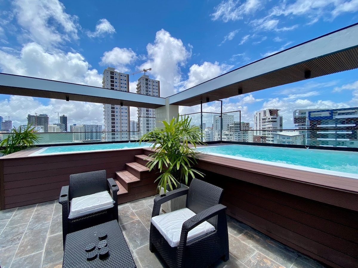 Central apartment in the heart of Ensanche Piantini, close to the best restaurants, supermarkets, pharmacies, just steps from shopping centers. Super quiet, safe and exclusive area!! You will have a great experience with our gym, Infinity pool and wonderful rooftop terrace with ocean views and 360 views of the entire city of Santo Domingo. You'll love it!