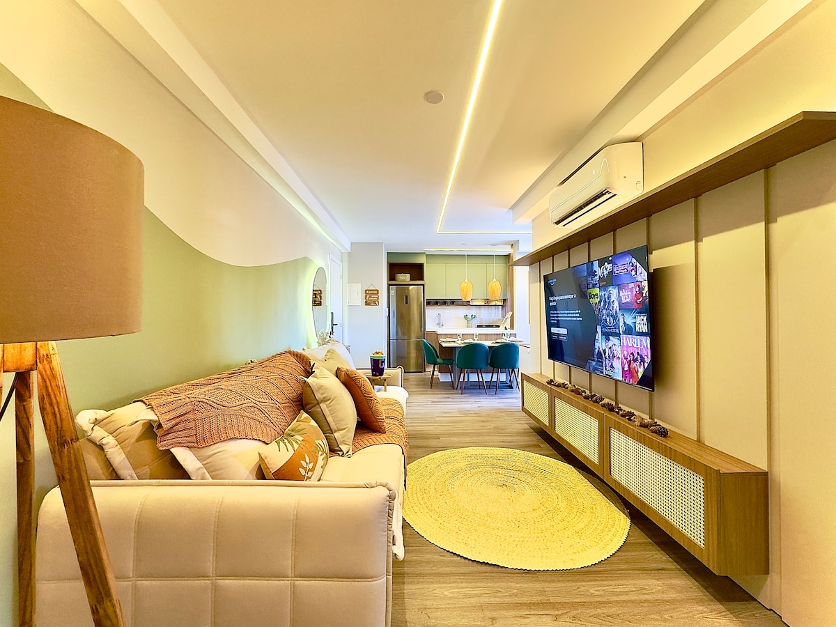 Lindo apto finamente mobiliado, totalmente climatizado. Possui 75m² com varanda fechada e vista lateral mar. Suíte com cama queen mais um dormitório com cama de casal, ambos com Smart TV. Cozinha, sala e sacada com churrasqueira integrados em conceito aberto. A cozinha é equipada com móveis planejados, fogão, forno elétrico, geladeira e microondas, além dos demais utensílios. Lavanderia com lavadora e secadora à disposição.