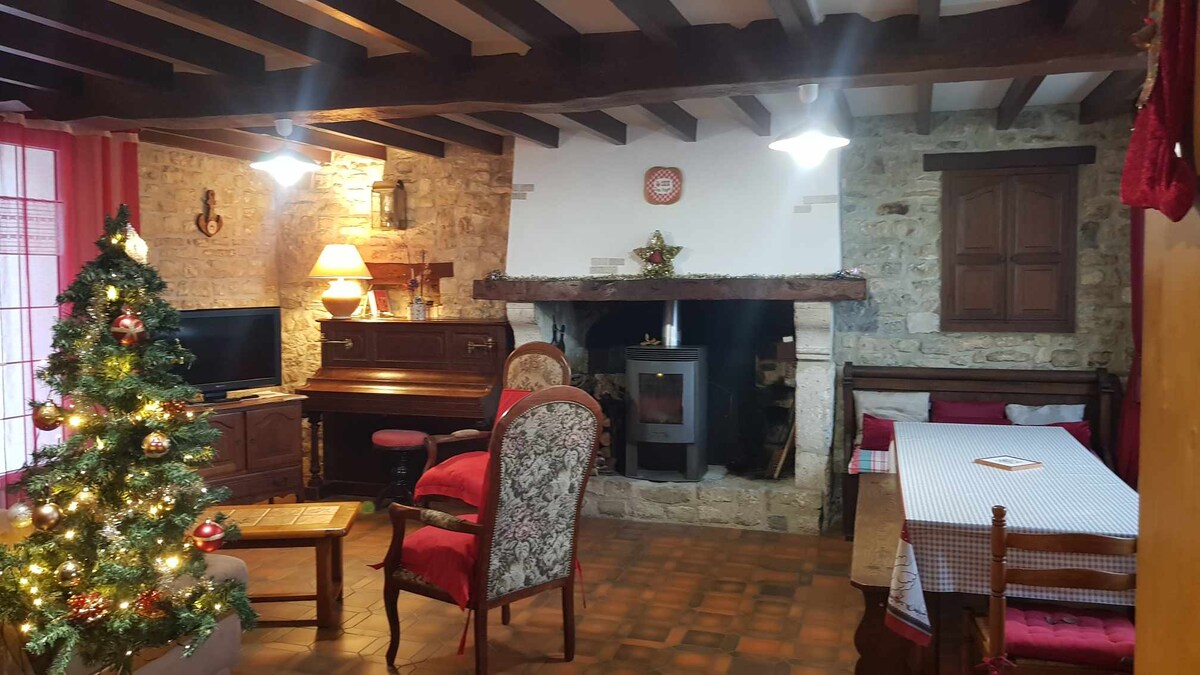 IZJEMNA HIŠKA NA DEŽELI V stavbah GRADU, KI DATIRA IZ 16. STOLETJA (200 m2) lahko sprejme do 6 oseb : - 1 velika spalnica zgoraj (1 zakonska postelja + 1 enojna postelja) - 1 druga velika spalnica zgoraj (1 zakonska postelja) - 1 dodatna postelja na pristanku v zgornjem nadstropju - 1 kopalnica (s kadjo) v zgornjem nadstropju - 2 stranišči (v pritličju in v nadstropju) - 1 velika dnevna soba - Velik kamin (v funkciji) in opremljena kuhinja, ki je odprta za jedilnico. - 1 sedlec