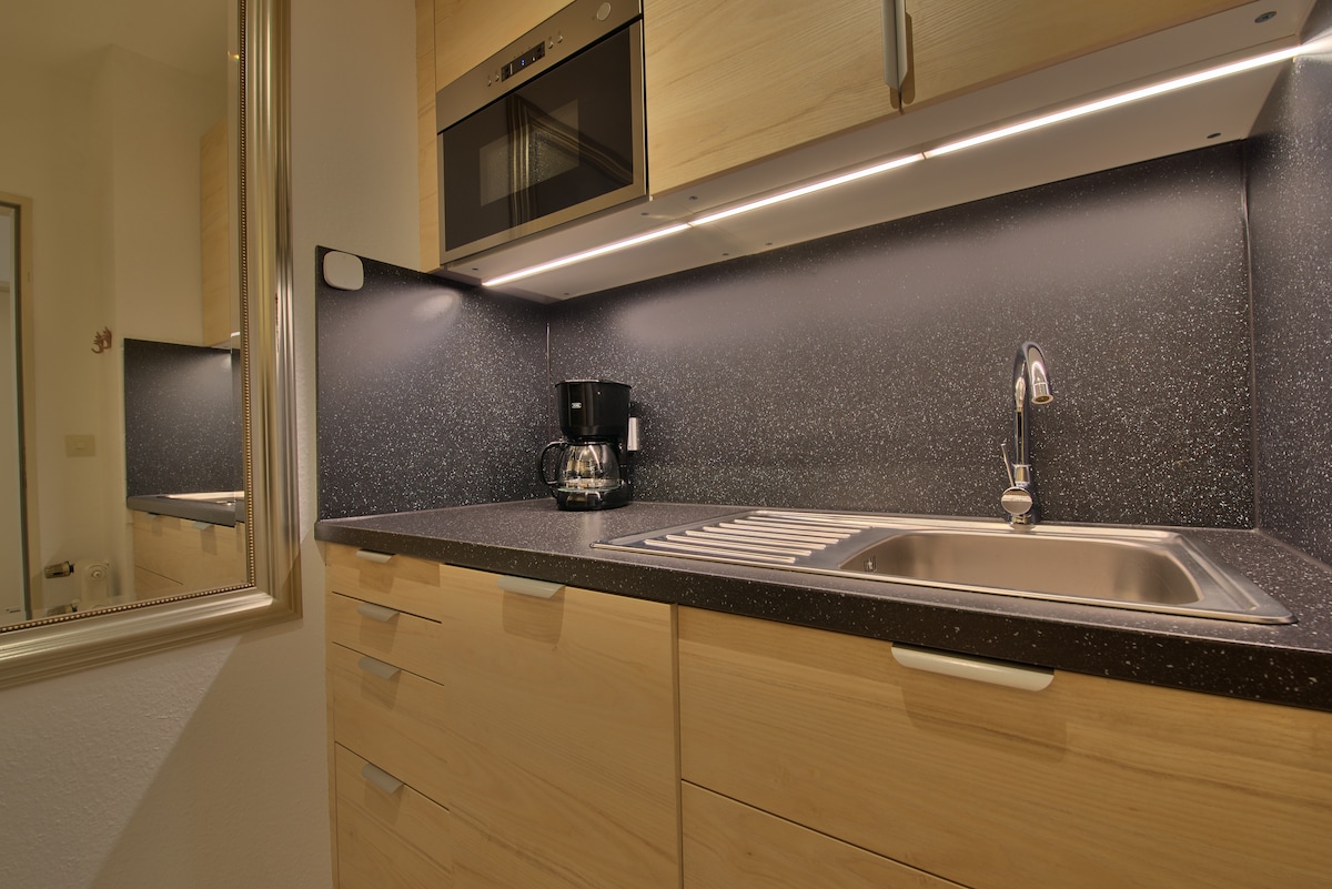 Stanovanje ima odprto novo kuhinjo, vključno z Mikrovalovna pečica in aparat za kavo prek nove, sodobne kopalnice ter udobnega prostora za sedenje s kaminom in spalnico z zakonsko posteljo. Stanovanje vključuje teraso, kjer lahko uživate v čudovitem pogledu na gore. Poleg tega lahko uporabite tudi sobo za jogo, savno (PG 20 EUR), bazen z izvirsko vodo, domači kino in veliko teraso z žarom in ognjiščem. Na voljo so tudi krplje.