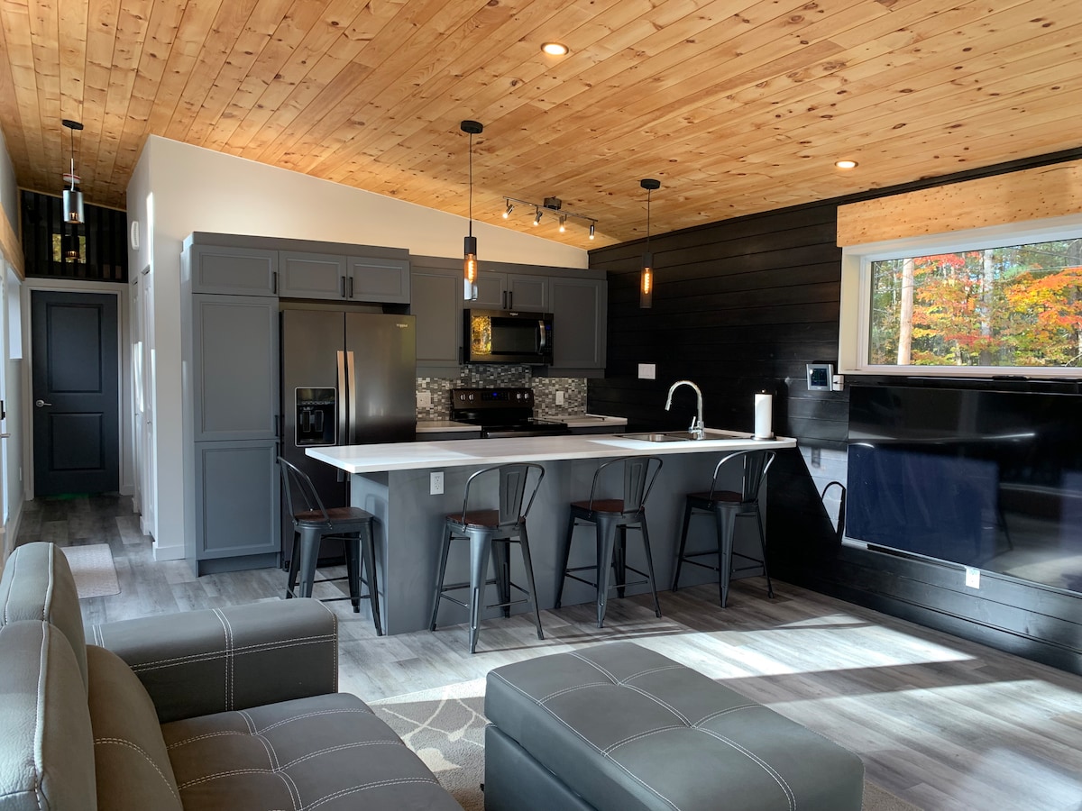 Pobegnite v butično razkošno kočo Aux Box, ki se nahaja v gozdu Muskoka z mirnim razgledom na reko. Zasnovan je za udobje in slog ter vključuje talno ogrevanje, omarice po meri in vrhunsko opremo. Stopite v zasebni nordijski spa s savno, masažno kadjo in hladnim potopom za popolno sprostitev. Uživajte v popolni odmaknjenosti, medtem ko ste manj kot 10 minut stran od trgovin, restavracij in šarma središča Huntsvilla. Čaka vas popolna mešanica narave in razkošja.