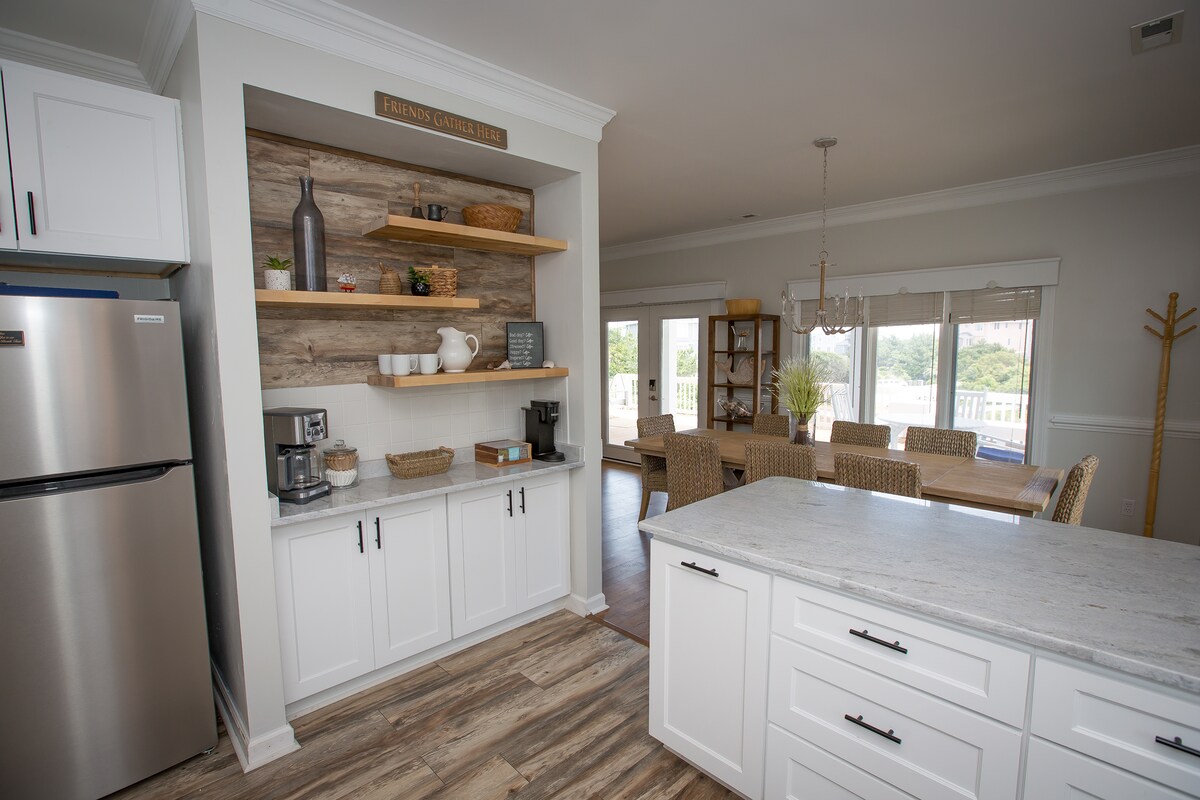 To čudovito prenovljeno prenočišče, PRIMERNO ZA HIŠNE LJUBLJENČKE, je polno opreme, vključno z biljardno mizo, igralnico, kinodvorano, ogromno zunanjo teraso, ognjiščem, ograjenim dvoriščem, parkiriščem za čolne in klančino za čolne v zasebni skupnosti. To prostorno prenočišče, ki se nahaja med Atlantic Beachom in Smaragdnim otokom, je le kratek sprehod do našega zasebnega dostopa do plaže, akvarija NC, restavracij ob plaži, parkov, mini golfa, kartinga, vodnih parkov in še več.