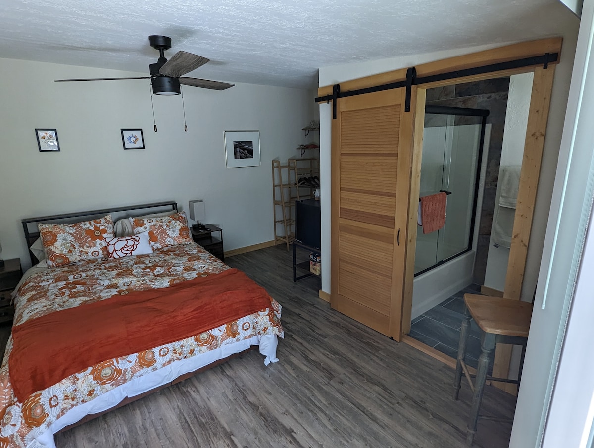 Studio Apt is 650 sq ft, on ground floor of our home with private entry, located on quiet hill on private street, yet only 1 mile from Historic Main St. 1 Queen Bed, 1 dbl size Futon/lounger, seating area, dining table & chairs, Lg Flat Screen & frig. Private bathroom. In the breezeway, we offer a coffee bar w/ microwave, toaster, washer & dryer. Patio w/ table & chairs directly outside the studio & guests have access to large lower deck with picnic table. We accept dogs, can't accept cats.