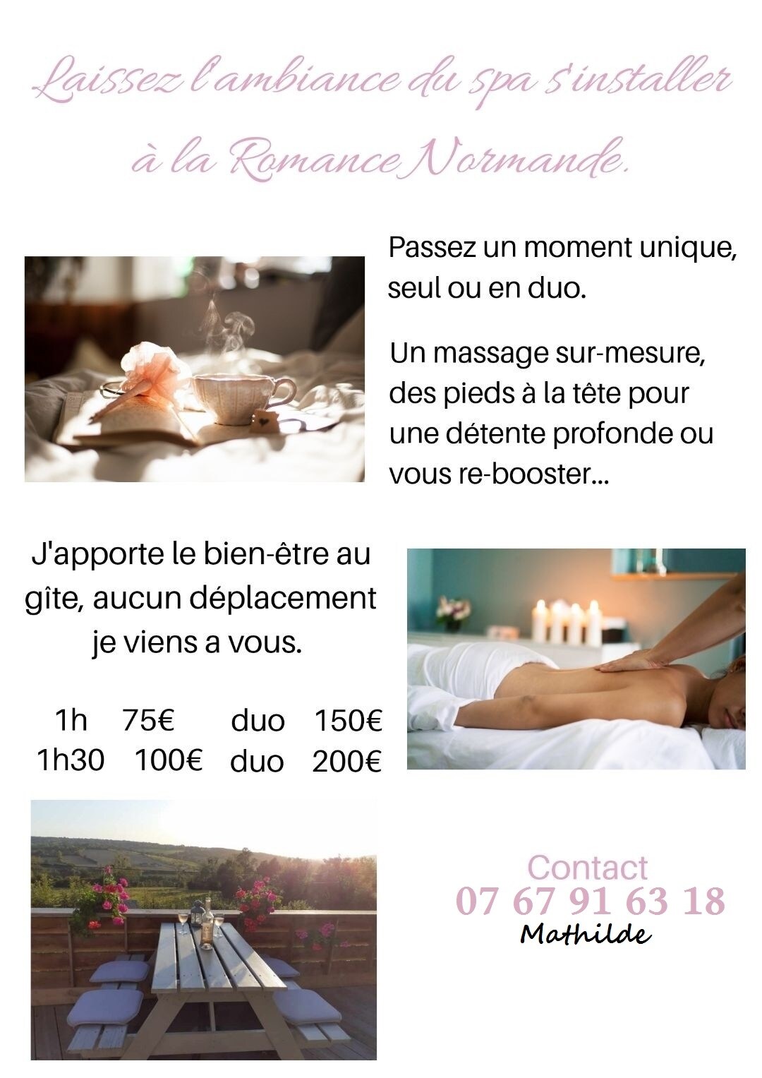 Au coeur de la vallée d'Auge, à 10 mn de la A13, 20 mn de Deauville et de Honfleur, vous découvrirez un gîte dédié aux amoureux où romantisme, confort et bien être sont les maîtres mots. Dans un environnement verdoyant, vous vous ressourcerez en profitant d une balnéo et massages* en duo ou solo, de champagne*, d'un plateau de fruits de mer* sur commande. L'accueil est quotidien à partir de 17h et le départ le lendemain est à 11h précédé d'un petit déjeuner* *(nous consulter pour les tarifs)
