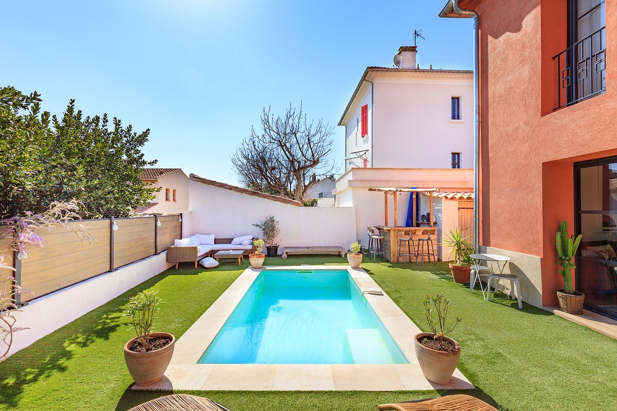 Domaine la Pastorale - Ollioules/Sanary Provansalska luksuzna kamnita vila s površino 300 m2 z osupljivim razgledom na oljčne nasade in morje. Poleg izjemne lokacije v Provansi-Alpes-Côte d 'Azur, v bližini pristanišča Sanary/sea in njegove najlepše tržnice v Franciji 2018 . Namestitev ima štiri spalnice, vsaka s svojo kopalnico za 8 oseb, prostoren zasebni ogrevan bazen (dodatno) sredi bujnih vrtov in vinogradov na parceli 3 hektarjev.