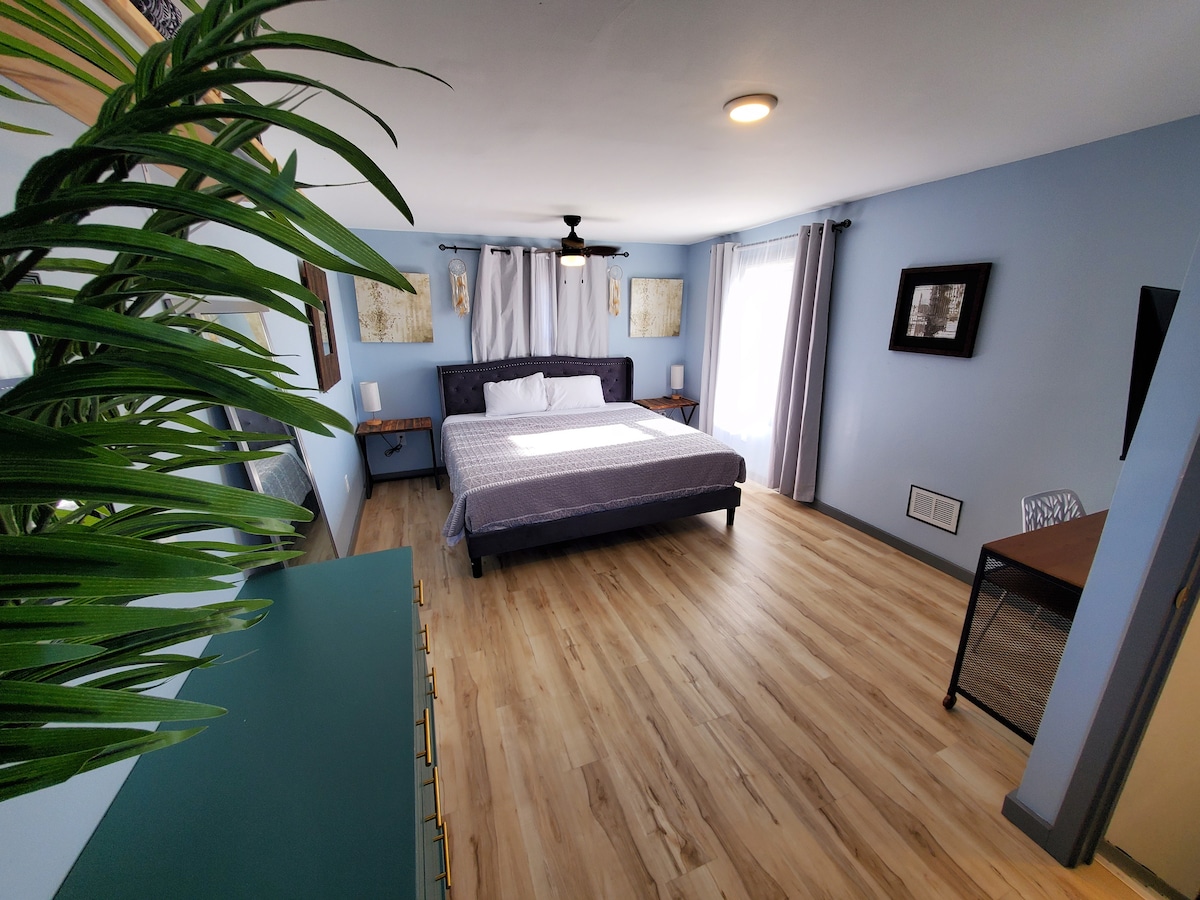 Peaceful, fun, open, intentionally designed 3 bedroom oasis in central Kearney, Nebraska. 🏡 King suite, Queen bedroom, Full over Full "Bunkhouse", Futon, 2 couches, twin floor bed & Queen Air Mattress Roku TVs & extra blankets in every room PS4 Foosball 🤙 Boho Hanging Egg Chairs Dining table seats 8 Coffee bar ☕️ Butcher block Full fridge & freezer Washer & Dryer Tons of games Privacy fenced yard w/ large deck, dining table, fire table, grill, & hammocks! Play & relax 🪴🏡🪴