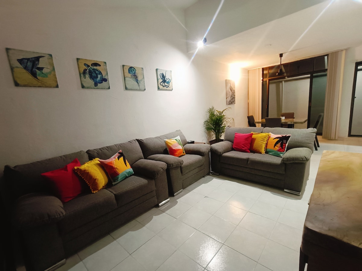 Disfruta con toda la familia en este alojamiento con estilo. Ubicado en el sector K a poco tiempo de las playas de Bahías de Huatulco. Departamento nuevo, elegante, tranquilo y con todos los servicios necesarios para lograr un descanso placentero. Hay acceso a una alberca compartida en la azotea. Se cuentan con 2 habitaciones, una con 2 camas individuales y la recamara principal con una cama King y un sofá cama y en la sala otro sofá cama en caso de agregar a una quinta persona.