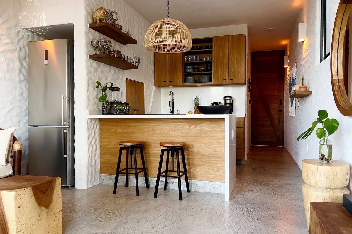 Great speed WiFi reliable for working remotely, Cozy apartment in Sayulita downtown just 2 blocks away from the beach. 2 bedroom and 2 sofa beds, capacity 6 pax total. Garden area and large room with high ceilings giving a balance of luxury and comfort, for relaxation and tranquility. You can enjoy coffe shop, bars and restaurants to delight your palate just a few steps away, it includes air conditioning, automatic controlled access, parking space, incredible lounge pool.